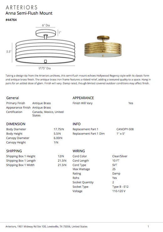 Taking a design tip from the Arteriors Home archives, the Anna Semi-Flush Mount echoes Hollywood Regency style with its classic form and antique brass finish. The antique brass iron frame features a ribbed relief, adding a textured quality to a space. Hang in pairs for an added dose of glam. * The finish will vary. *Damp rated, though limited covered outdoor conditions may affect the finish.