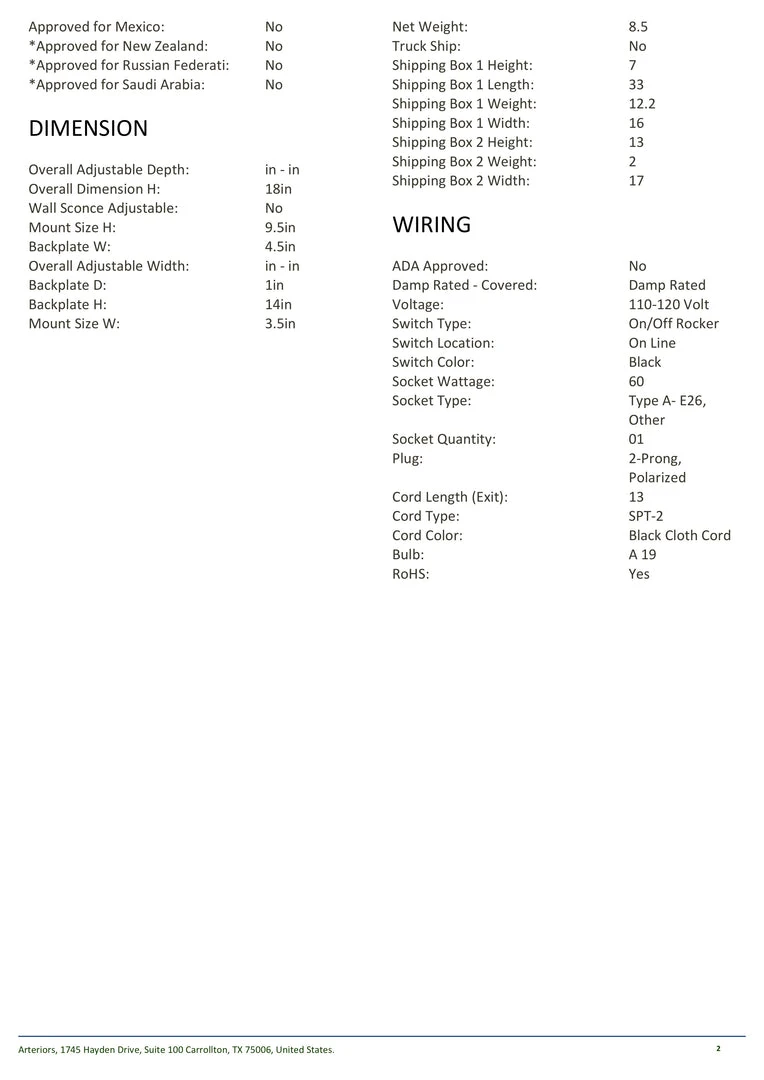 | Materials | Metal; Antique Brass; Bronze Finish; Damp Rated – Covered: Damp Rated; Voltage:110-120 Volt; Switch Type: On/Off Rocker; Socket Wattage:60; Socket Quantity:01; Cord Length (Exit):13; Bulb: A 19 |