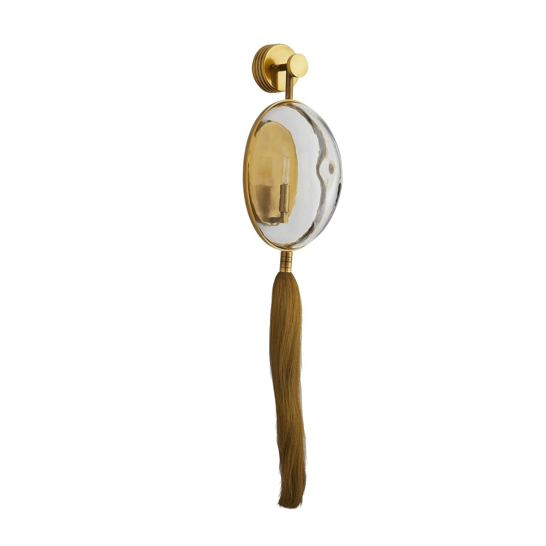The Arteriors Home Aramis Wall Sconce in antique brass designed by Barry Dixon was inspired by McQueen’s ponytailed models with face masks which then evolved into the totally unique, avant-garde Aramis Wall Sconce, couture for the home. This lighting is cast in brass with a convex glass shield and a brass wire ponytail the Aramis Wall Sconce is ideal in the entry, powder room, dining room, hallway, or office. Â
