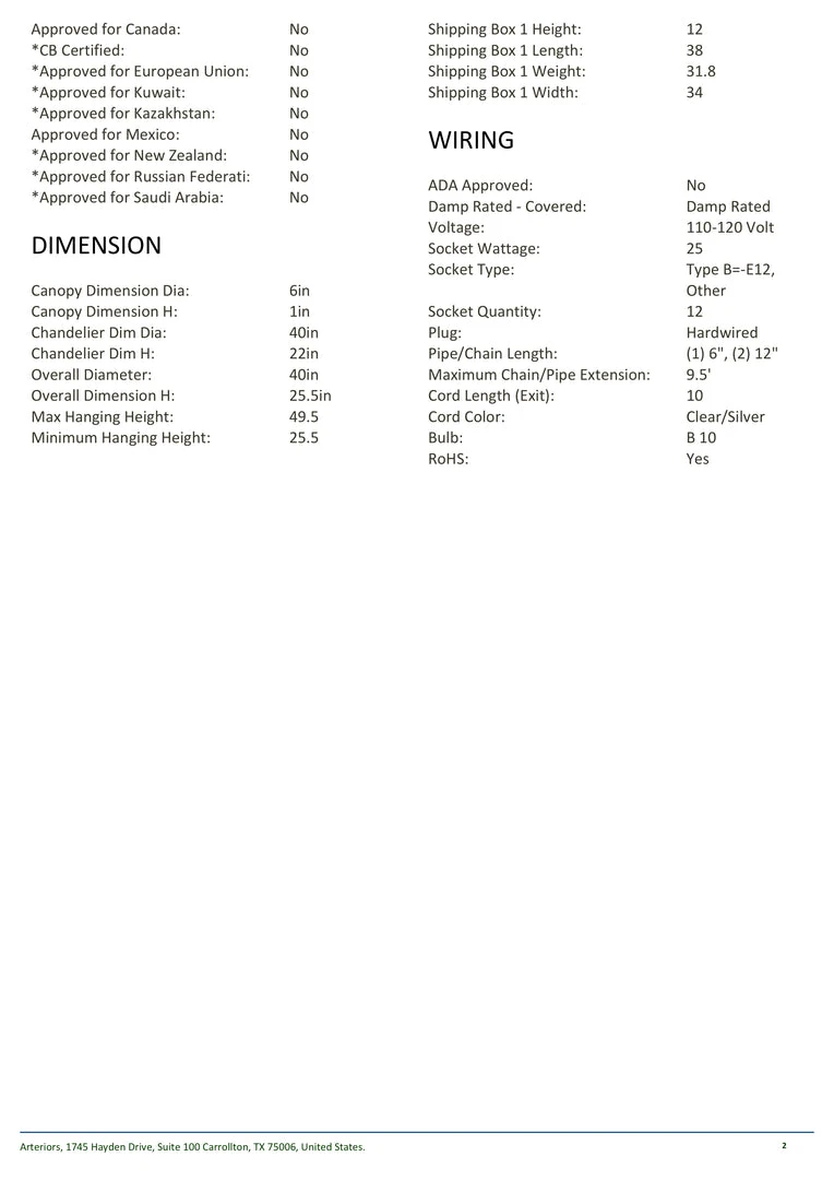 | Materials | Steel; Glass; Antique Brass; Damp Rated – Covered:Damp Rated; Socket Wattage:25; Socket Type:Type B=-E12 Other; Socket Quantity:12; Pipe/Chain Length:(1) 6":(2) 12"; Maximum Chain/Pipe Extension:9.5'; Cord Length (Exit):10 ;Bulb:B 10 |