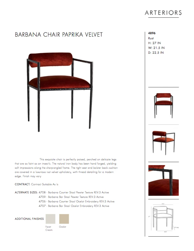 The Barbana Chair in Paprika Velvet from Arteriors Home is perfectly poised, perched on delicate legs that are as faint as an insect’s. The natural iron body has been hand forged, yielding soft impressions along with the sharp-angled frame. The tight seat and bolster back cushion are covered in a luxurious rust velvet upholstery, with thread detailing for a modern edge. *Finish may vary