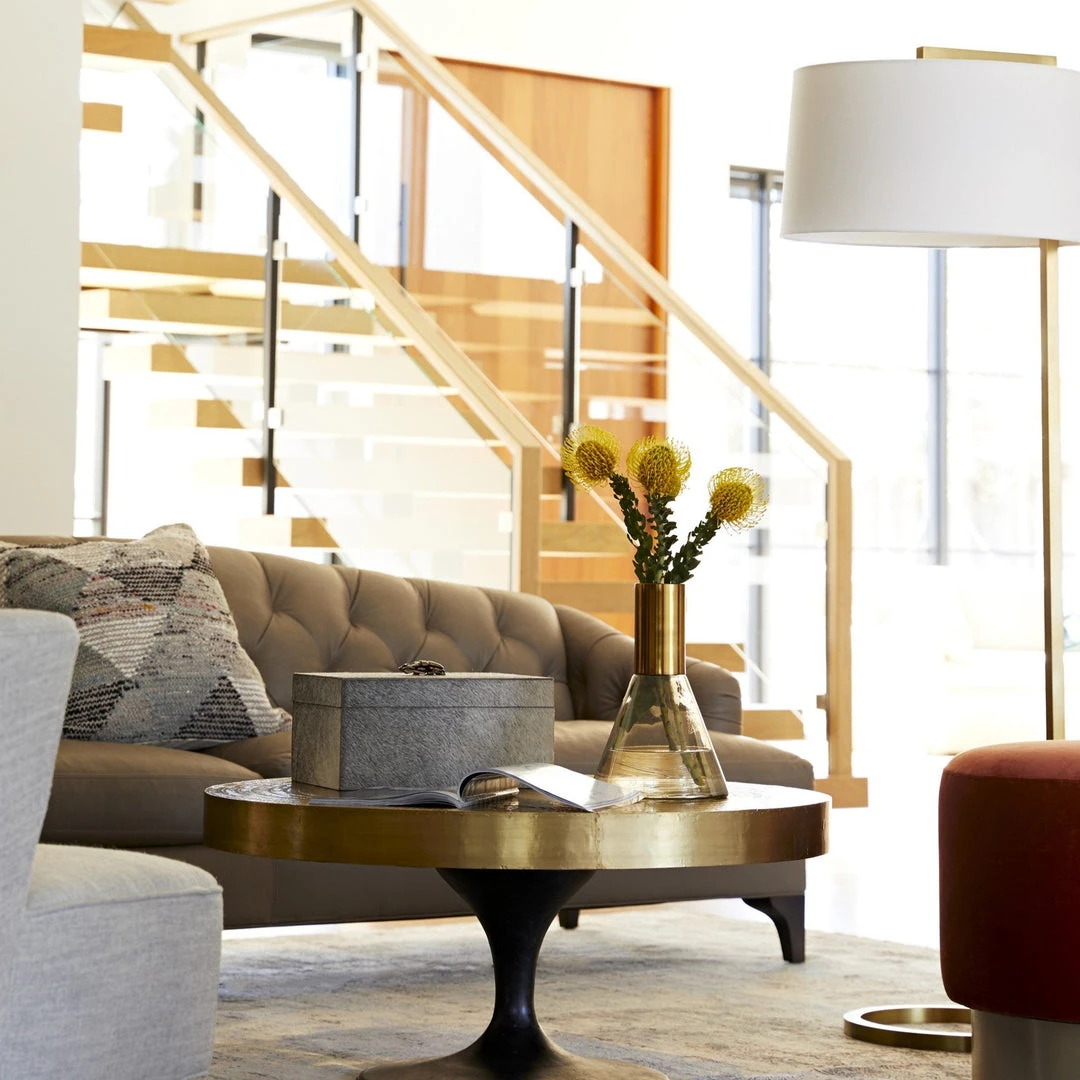 Simple and sophisticated, this Belden Floor Lamp in Antique Brass from Arteriors Home provides ample light without taking up much space. Its slender steel frame finished in a warm brass gives way to an open circular base and is paired with an off-white linen drum shade with white cotton lining. The Belden is the ideal lighting between two chairs or next to your lounge chair.