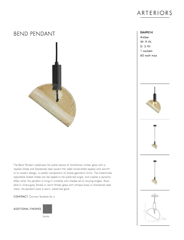 The Bend Pendant in Amber and Steel from Arteriors Home celebrates the subtle texture of hand-blown amber glass with a rippled shade and blackened steel accent that adds handcrafted appeal and warmth to its modern design, and careful composition of simple geometric forms. The streamlined, adjustable folded shade can be tipped to the preferred angle, and creates a dynamic effect when the pendant is hung in multiples with shades set at varying angles. Available in silvery-grey Smoke or warm Amber glass with antique brass or blackened steel metal, the pendant casts a warm, patterned glow.