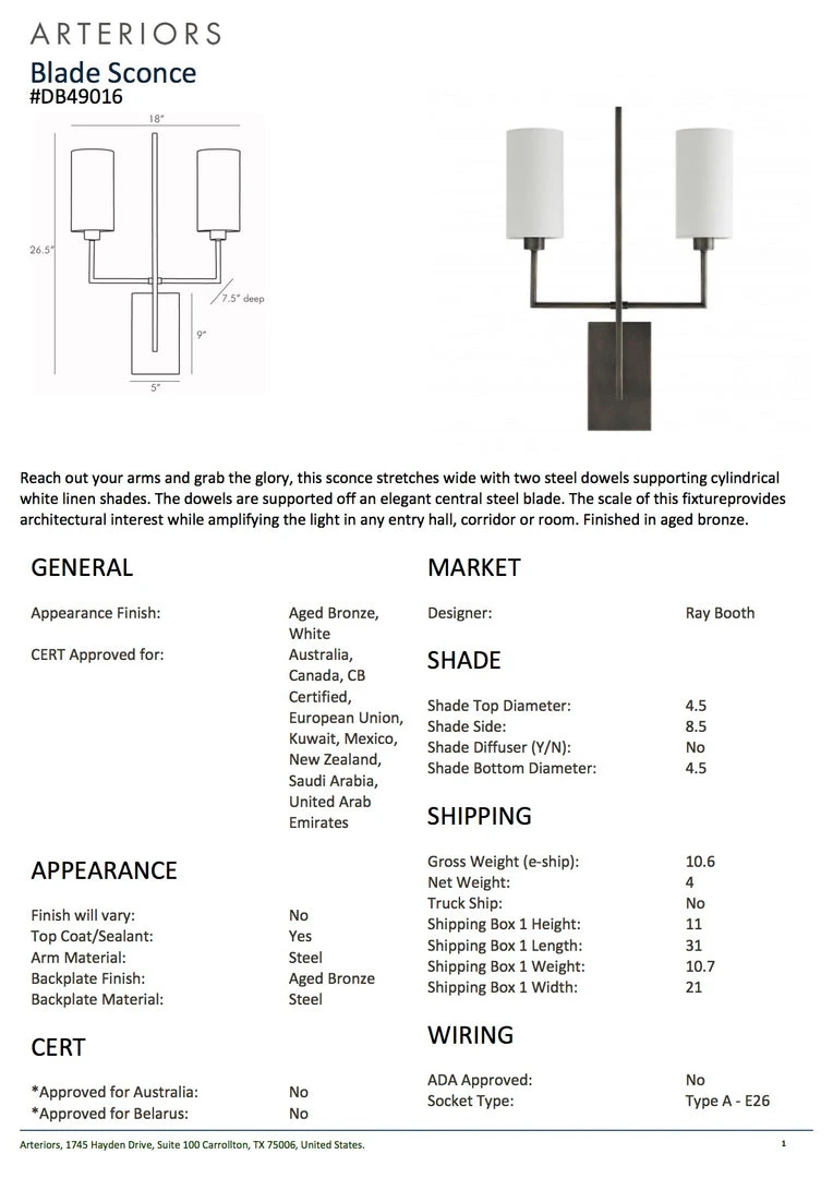 Reach out your arms and grab the glory with the Blade Sconce in Aged Bronze from Arteriors Home. Part of the Ray Booth Collection, this sconce stretches wide with two steel dowels supporting cylindrical white linen shades. The dowels are supported on an elegant central steel blade. The scale of this fixture provides architectural interest while amplifying the light in any entryway, hallway or living space.