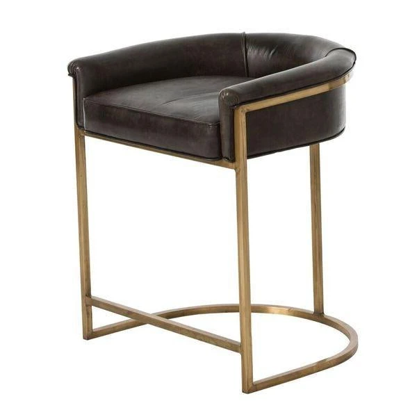 The Arteriors Home Calvin Counter Stool in Brindle top grain leather and antique brass finish is designed to slide under the kitchen counter when not in use due to its dropped back and arm height. Counter stools like the Calvin Counter Stool from Arteriors Home add a luxe elegance to modern, contemporary decor schemes.