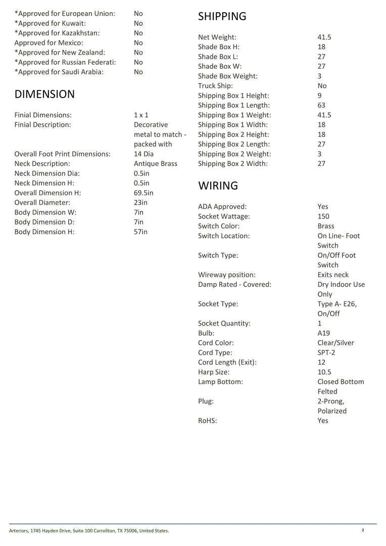| Size | 69.5" High x 23" Diameter; Base 14 |