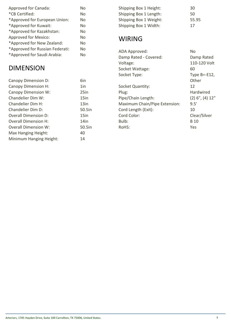 | Materials | Iron; Steel; Gold Leaf; Damp Rated – Covered:Damp Rated; Socket Wattage:60; Socket Type:Type B=-E12 Other; Socket Quantity:12; Pipe/Chain Length:(2) 6":(4) 12"; Maximum Chain/Pipe Extension:9.5'; Cord Length (Exit):10; Cord Color:Clear/Silver; Bulb:B 10 |
