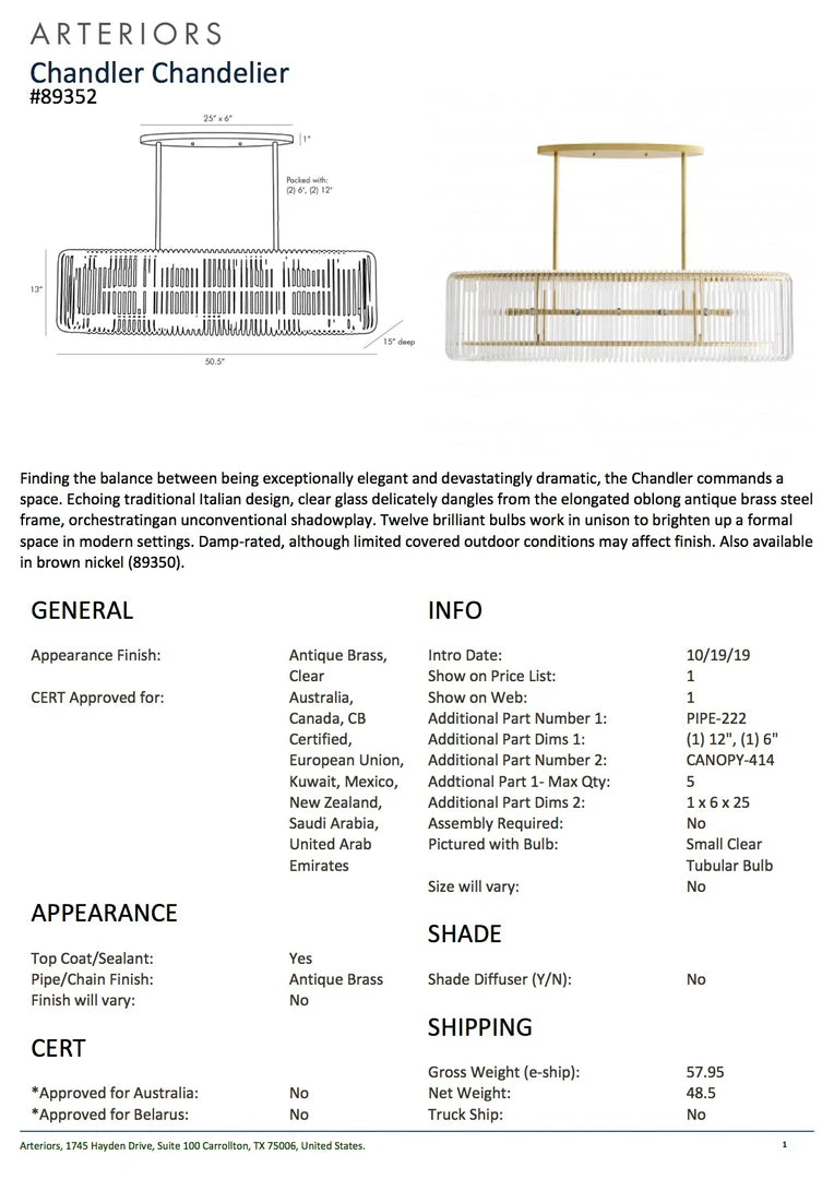 Finding the balance between being exceptionally elegant and devastatingly dramatic, the Chandler Chandelier in Antique Brass from Arteriors Home commands a space. Echoing traditional Italian design, clear glass delicately dangles from the elongated oblong antique brass steel frame, orchestrating an unconventional shadowplay. Twelve brilliant bulbs work in unison to brighten up a formal space in modern settings. *Damp-rated, although limited covered outdoor conditions may affect the finish.