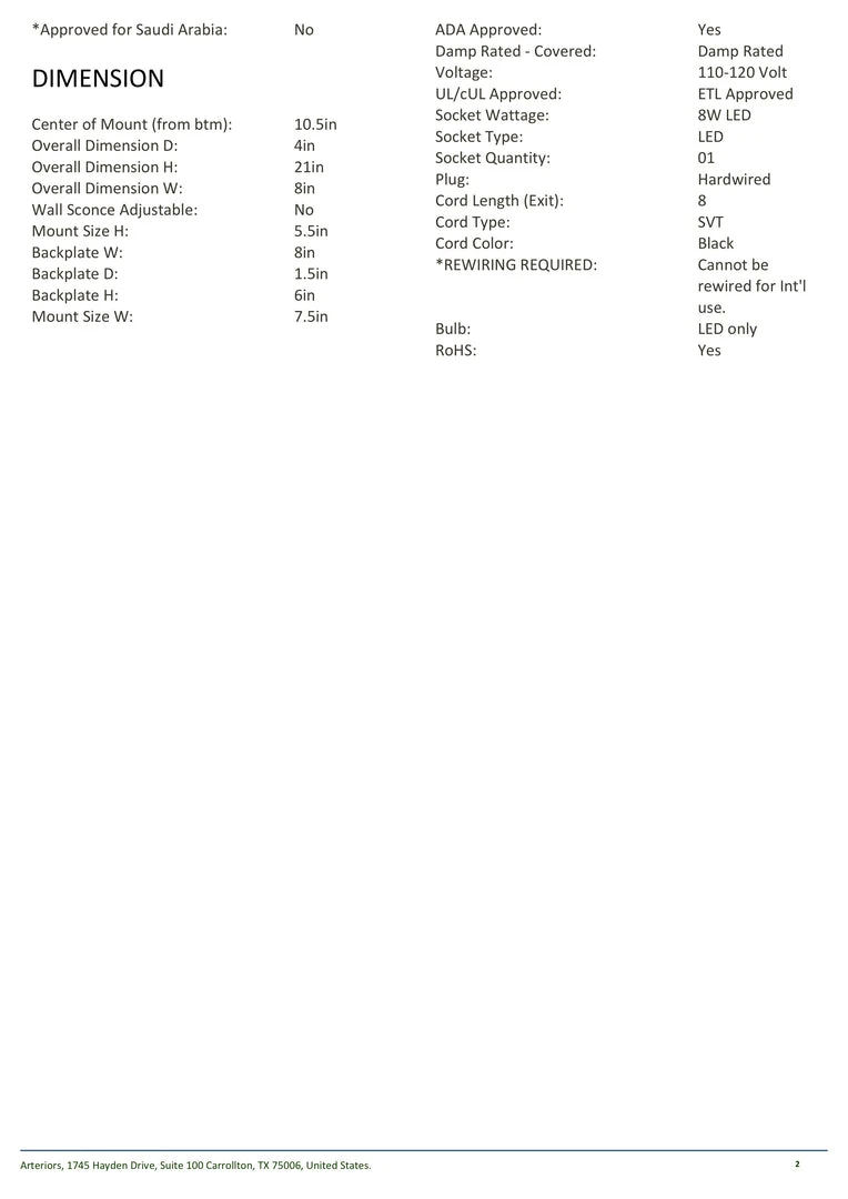 | Material | Marble; Steel; Antique Brass' Snow Marble; Damp Rated – Covered: Damp Rated; Socket Wattage:8; Socket Type: LED; Socket Quantity:01; Plug: Hardwired Cord Length (Exit):8; Cord; Bulb: LED |