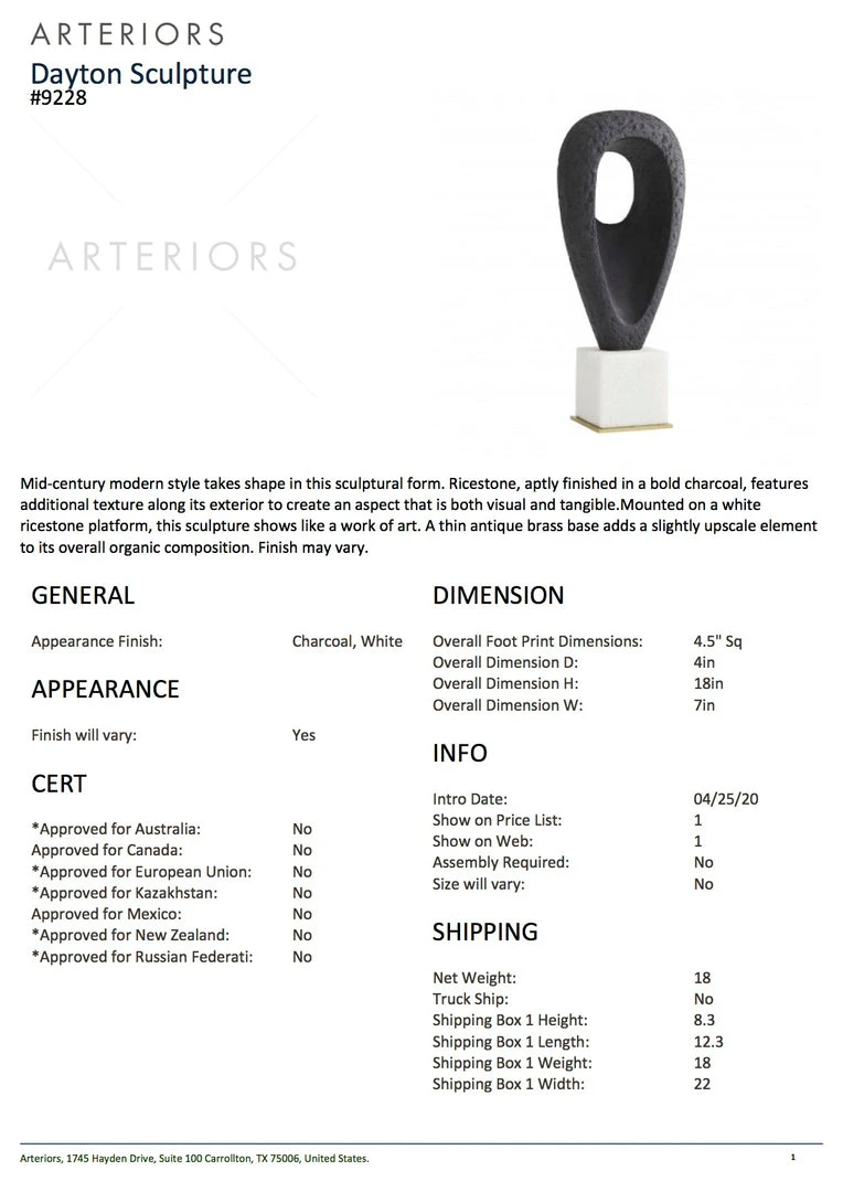 Mid-century modern style takes shape in the Dayton Sculpture from Arteriors Home. Ricestone, aptly finished in bold charcoal, features additional texture along its exterior to create an aspect that is both visual and tangible. Mounted on a white ricestone platform, this sculpture shows like a work of art. A thin antique brass base adds a slightly upscale element to its overall organic composition. *Finish may vary.