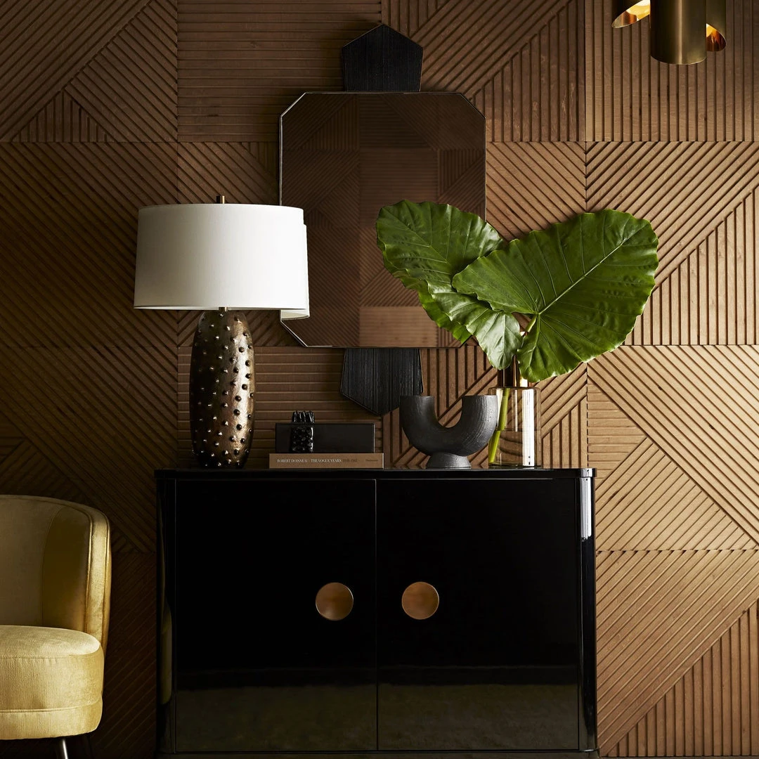 Reflect swank style in a simple form and instantly elevate a space with the Deborah Mirror from Arteriors Home. Chiseled black marble crowns accentuate its gold iron frame on opposing ends calling attention to its unique emerald cut shape. Its faceted form is not only functional but is a work of art for wall space. Security cleat hanging hardware allows for horizontal or vertical display. *Finish will vary.