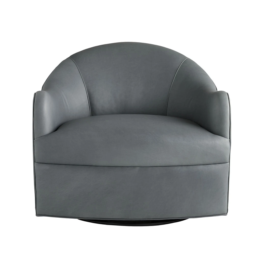 Delve into the depths of comfort with this luxe Delfino Chair Grey Leather Swivel from Arteriors Home. The deep seat and barrel back are comfortable and inviting, while the large-scale size provides an elevated level of comfort that is hard to resist. Upholstered in top-grain leather, this tub-style chair rests atop a blackened iron swivel base that is neatly concealed from view. Look to place this piece in your favorite entertaining space next to a drink table, or pair with another to create a cozy environment.