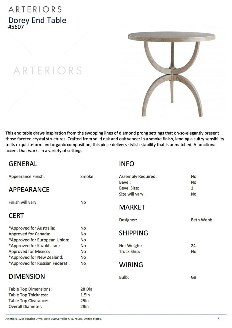 This Dorey End Table from Arteriors Home draws inspiration from the swooping lines of diamond prong settings that oh-so-elegantly present those faceted crystal structures. Crafted from solid oak and oak veneer in a smoke finish, lending a sultry sensibility to its exquisite form and organic composition, this piece delivers stylish stability that is unmatched. A functional accent that works in a variety of settings.