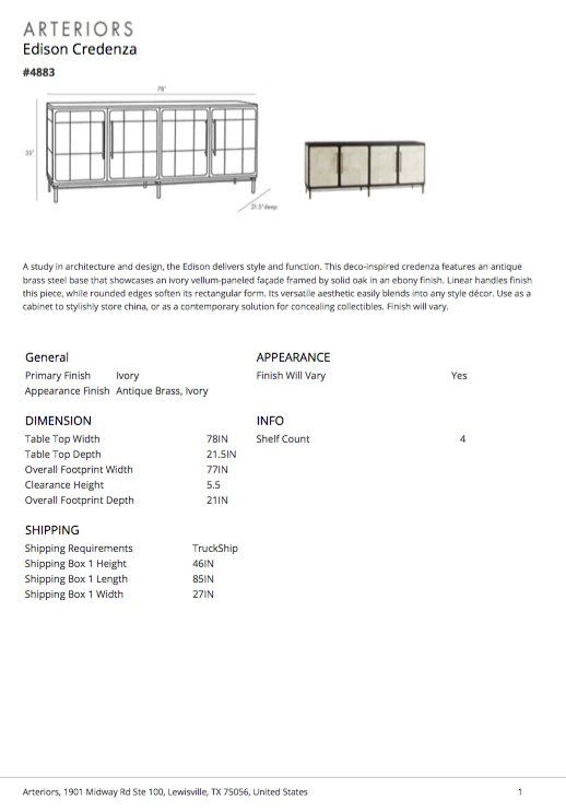 A study in architecture and design, the Edison Credenza from Arteriors Home delivers style and function. This deco-inspired credenza features an antique brass steel base that showcases an ivory vellum-paneled façade framed by solid oak in an ebony finish. Linear handles finish this piece, while rounded edges soften its rectangular form. Its versatile aesthetic easily blends into any style décor. Use as a cabinet to stylishly store china, or as a contemporary solution for concealing collectibles. *Finish will vary.