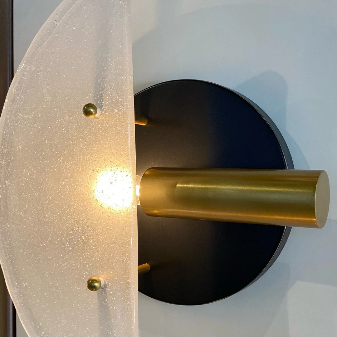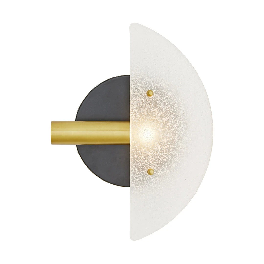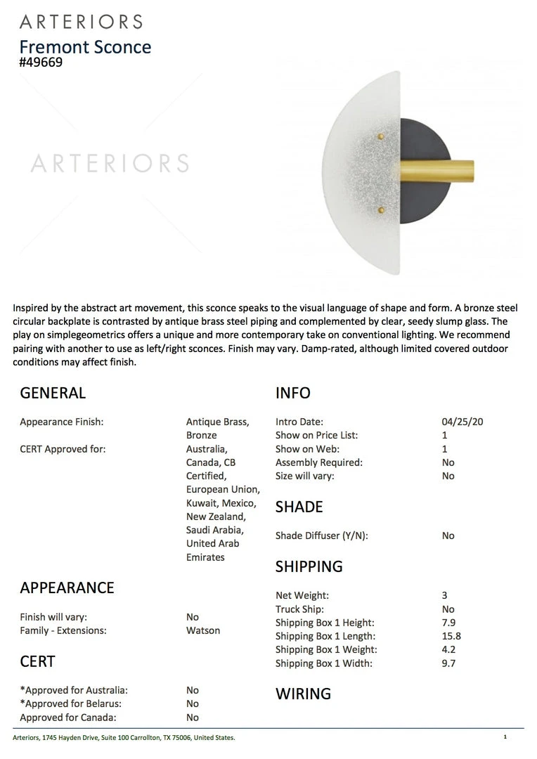 Inspired by the abstract art movement, the Fremont Sconce presented by Arteriors Home speaks to the visual language of shape and form. A bronze steel circular backplate is contrasted by antique brass steel piping and complemented by clear, seedy slump glass. The play on simple geometrics offers a unique and more contemporary take on conventional lighting. Pair the Fremont with another to use as left/right sconces. *Damp-rated, although limited covered outdoor conditions may affect the finish.