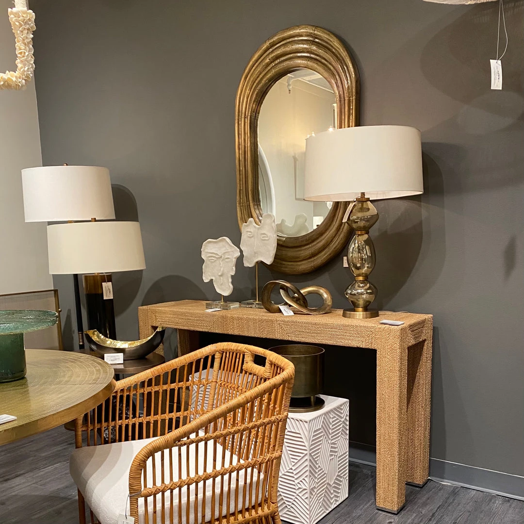 Expanding on an Arteriors design classic, the Georgina Mirror from Arteriors Home features antique brass and plain glass artistically paired to create a visually commanding mirror. Concentric pillowed ribbing creates a visual effect that the frame is growing outward from the center, making this an exceptional piece to add depth to a space. The brass-clad foundation is finished in a moody dark antique look we adore. Security cleat hanging hardware allows for vertical or horizontal display. *Finish will vary.