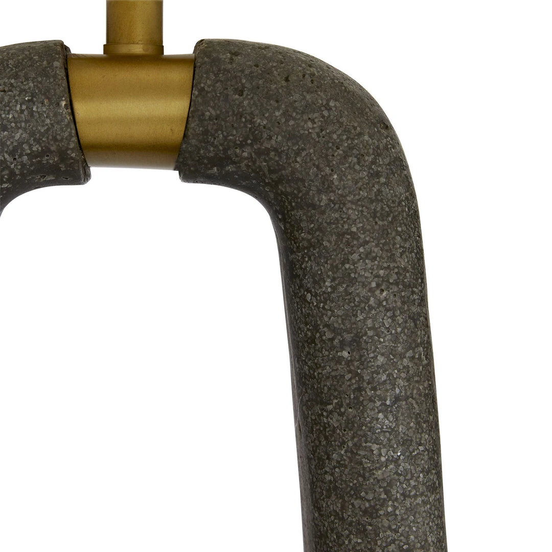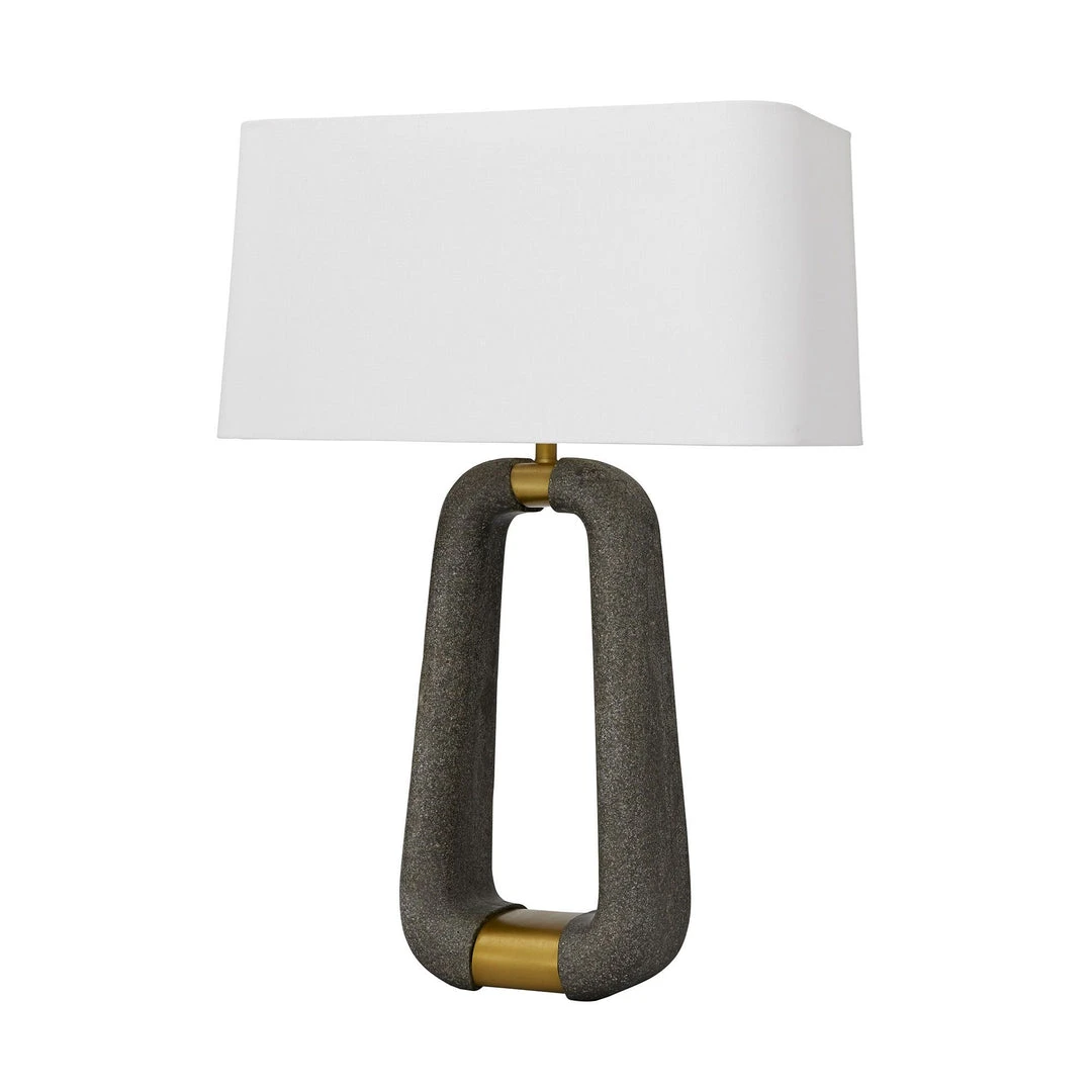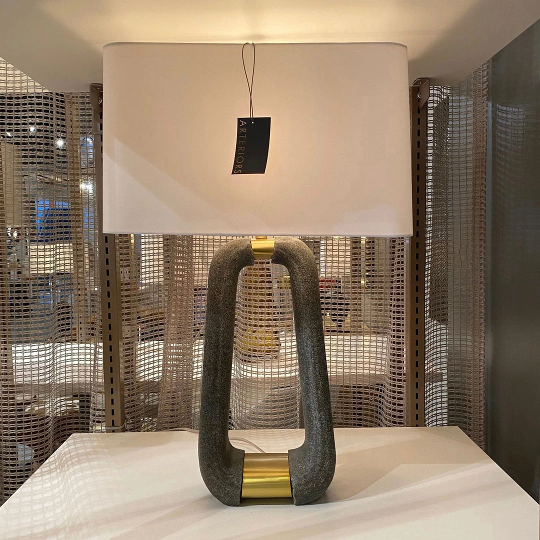 The equestrian-inspired shape of the Gianni Lamp from Arteriors Home features a graphite ricestone composite met with antique brass. The Gianni adds modern luxe and organic touch to a space. Topped with a rectangular white linen drum shade with white cotton lining and a matching ricestone finial, the Gianni graces entryways, bedrooms, and living spaces with chic style.