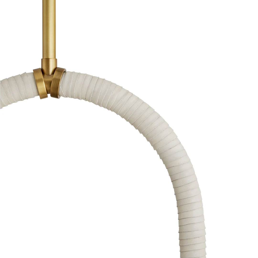 Minimalist and modern, the Harrison Chandelier in Antique Brass Brass from Arteriors Home is a paradigm of linear lighting. Its lined silhouette presents six opal glass globes and is composed of antique brass steel that has been wrapped in cream leather. The middle of the frame features an arch that was inspired by the grand corridors of historic buildings, lending an architectural element to its straightforward design. Additional pipe available (PIPE-172). *Damp-rated, though limited outdoor conditions may affect the finish.