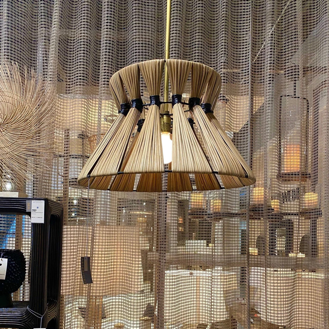 The Harvey Pendant from Arteriors Home features a design that is quite rare. Natural rattan is first steamed and then wrapped by hand onto a steel frame in a wheat sheaf fashion then cinched in a ponytail style with black rattan. An unrivaled design and use of mixed materials deliver captivating visual appeal. An antique brass pipe showcases the unique shade and delivers a contrasting element that elevates its natural aesthetic. The finish will vary. Additional pipe available (PIPE-101). Damp-rated, though limited outdoor conditions may affect the finish.