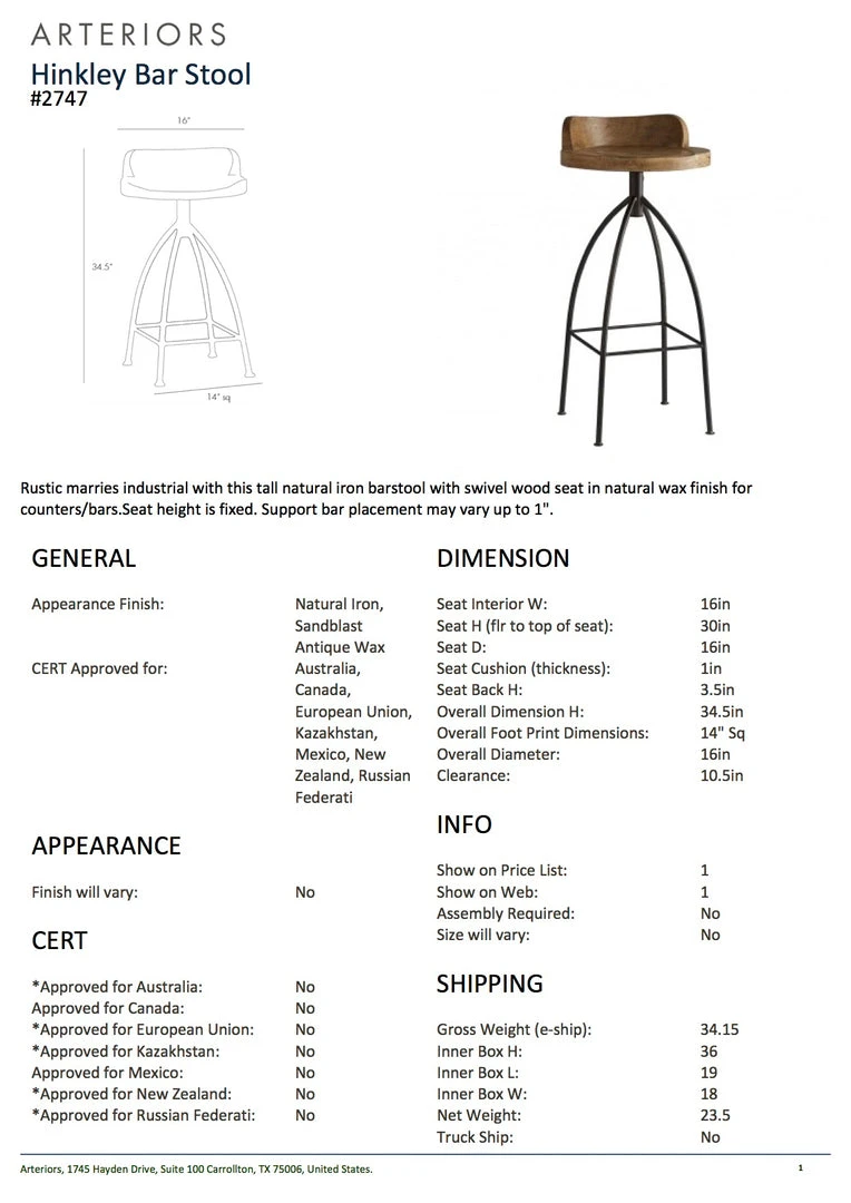 The Arteriors Home Hinkley Bar Stool blends rustic with chic. Natural material and industrial accents of the Hinkley make it the perfect seating for the kitchen. The swivel design makes it versatile to convenient for entertaining. As seen in Southern Living and House Beautiful Magazines!