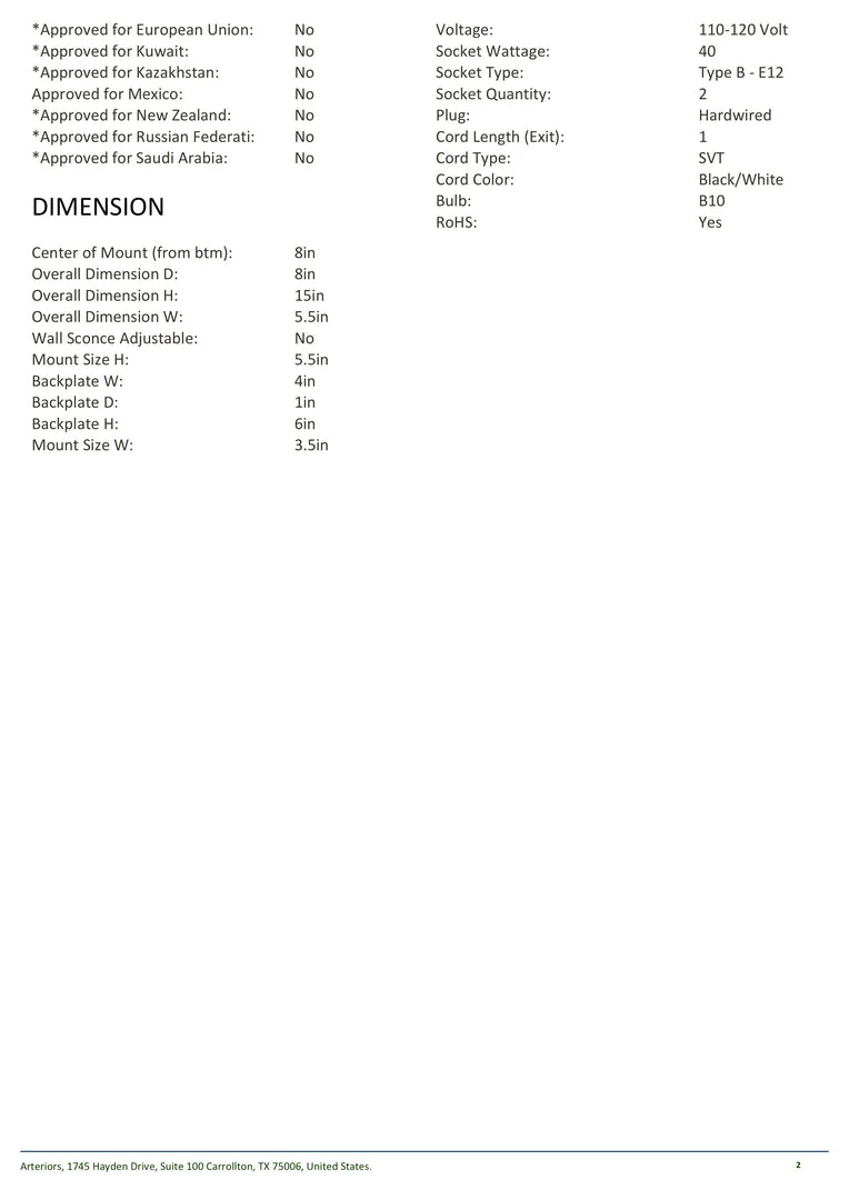 | Material | Steel; Brass Finish; Ivory/White Round Drum Shade; Hardwired Plug; 6' SPT-2 Black Cord; UL/cUL Approved; 110-120 Volt; Requires Two 40watt A19 Incandescent Bulb *Approved for use in covered outdoor areas. |