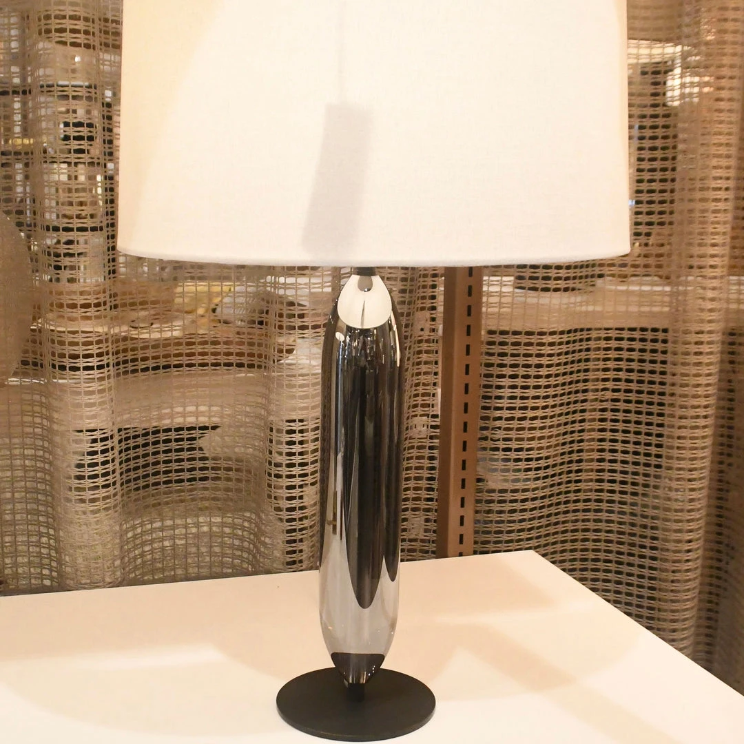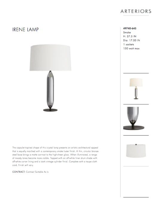 The capsule-inspired shape of the Irene Table Lamp from Arteriors Home presents an artistic architectural appeal that is equally matched with a contemporary smoke luster finish. A thin, circular bronze steel base brings a matte contrast to the high-sheen gloss. When illuminated, a range of moody tones becomes more visible. Topped with an off-white linen drum shade with off-white cotton lining and a dark vintage cylinder finial. Complete with a taupe cloth cord. *Finish will vary.