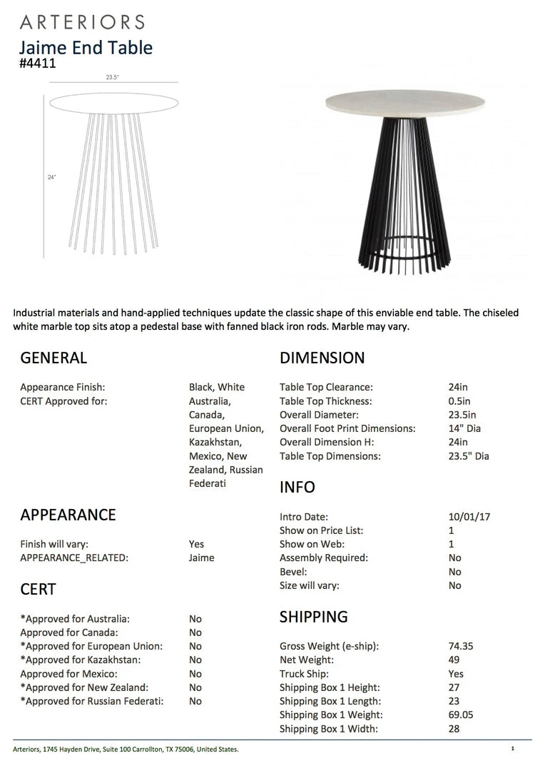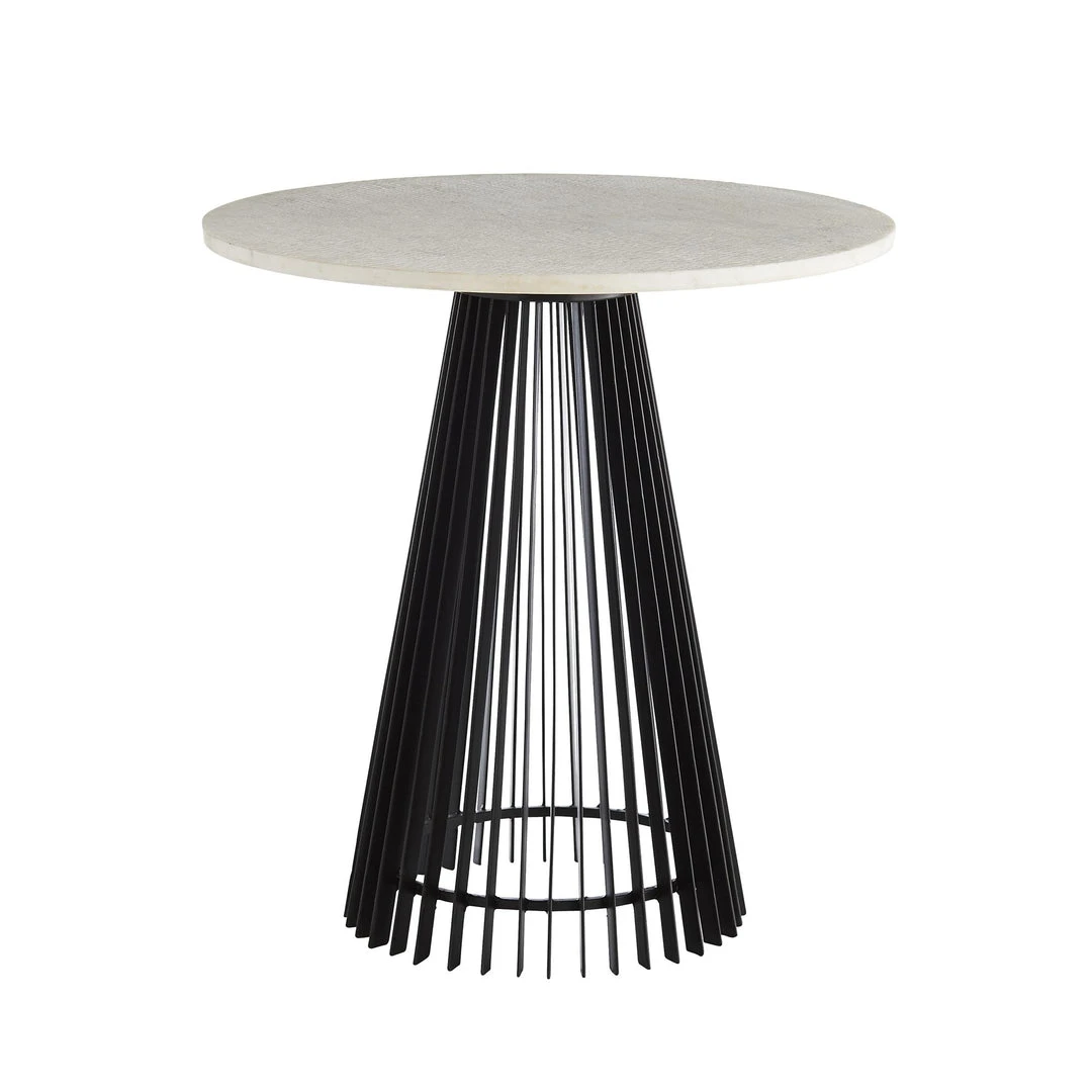 The Jaime End Table from Arteriors Home brings an industrial vibe to this classic shape with the materials and techniques used. The black iron rods secure the chiseled white marble top bringing a clean look to any room. The Jaime End Table by Arteriors Home brings an overall clean look and works well next to your favorite chair.