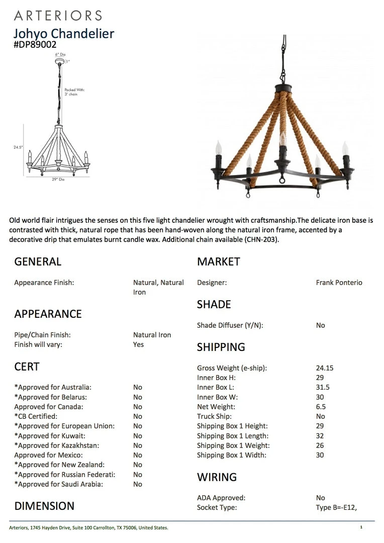 Old world flair intrigues the senses with the Johyo Chandelier from Arteriors Home. The delicate iron base of this dramatic hanging light is contrasted with a thick, natural rope that has been woven along the natural iron frame, accented by a decorative drip that emulates burnt candle wax. Place this five light chandelier in dining spaces, entryways, and living rooms. *Additional chain available (CHN-203).