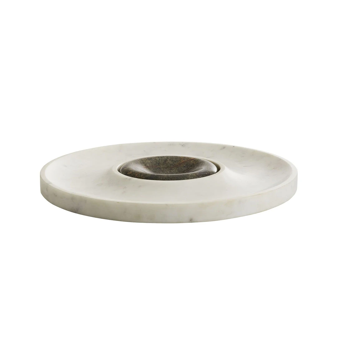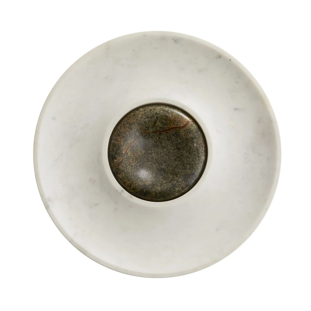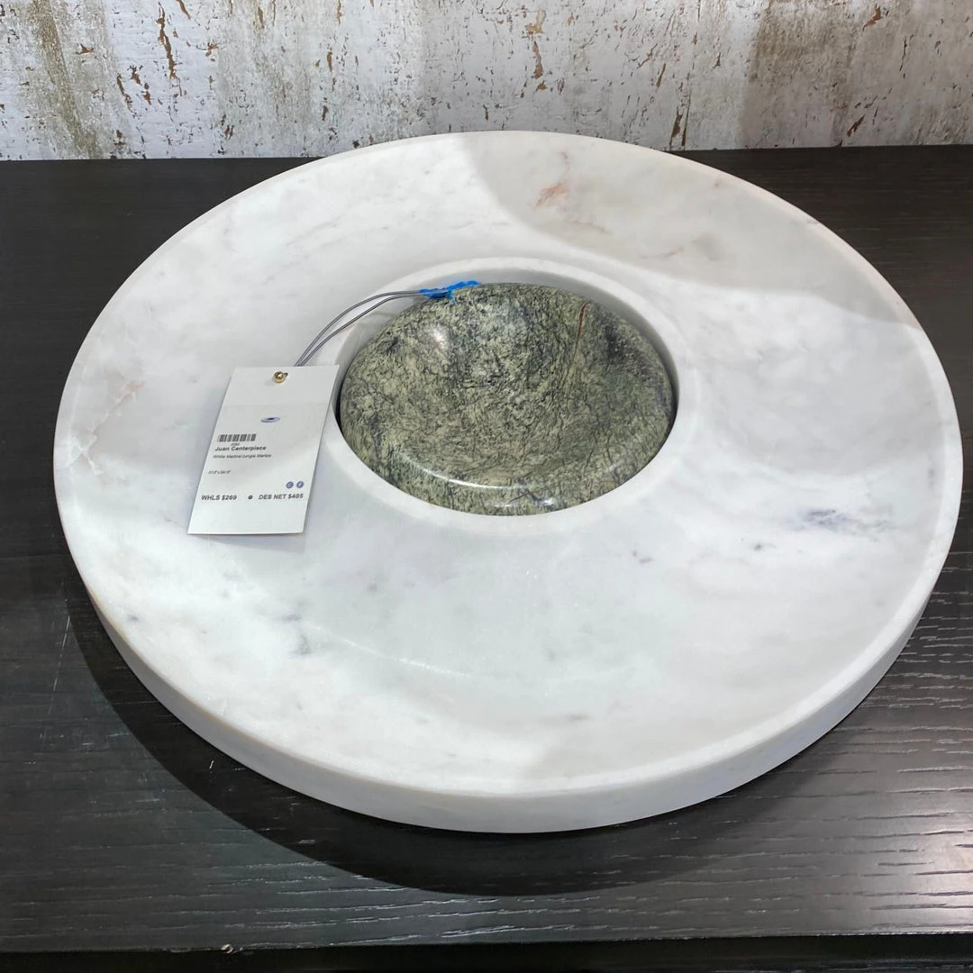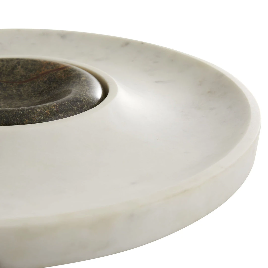 There is beauty in versatility. The Juan Centerpiece from Arteriors Home is elegantly crafted with its sleek curves, and is made to showcase an assortment of fruits or double as an hors d’oeuvre platter. The outer ring is made entirely of white marble, with a contrasting jungle marble center, all polished to an elegant sheen. Marble will vary.