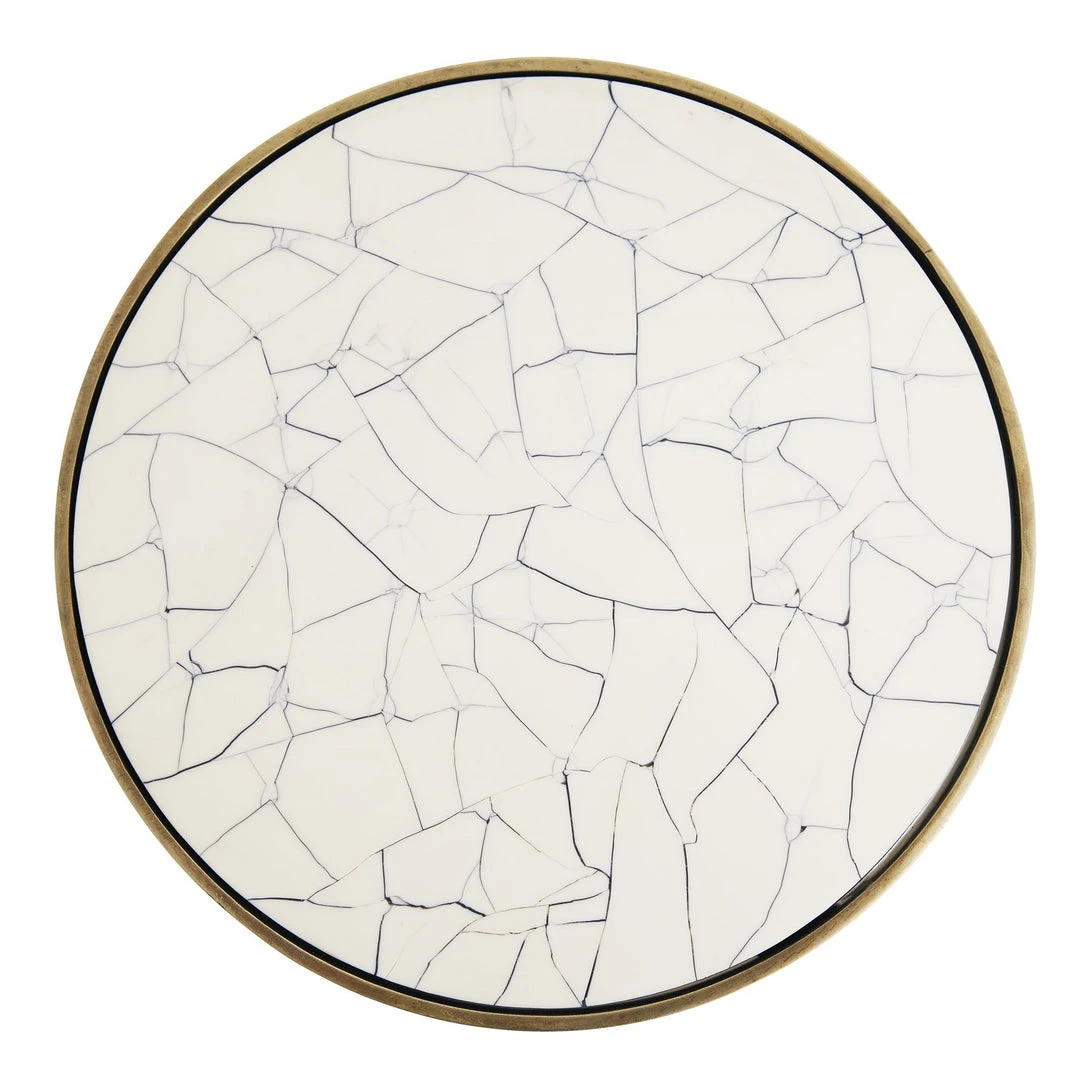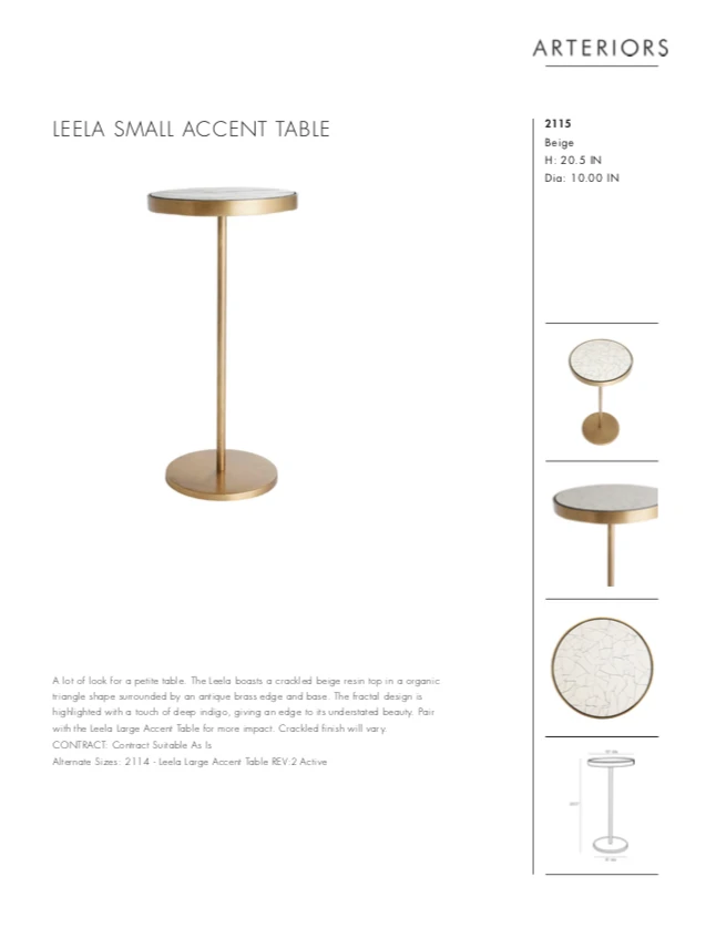 A lot of look for a petite table, the Leela Small Accent Table from Arteriors Home boasts a crackled beige resin top in a circular shape surrounded by an antique brass edge and base. The fractal design is highlighted with a touch of deep indigo, giving an edge to its understated beauty. Pair with the Leela Large Accent Table for more impact. *Finish will vary.