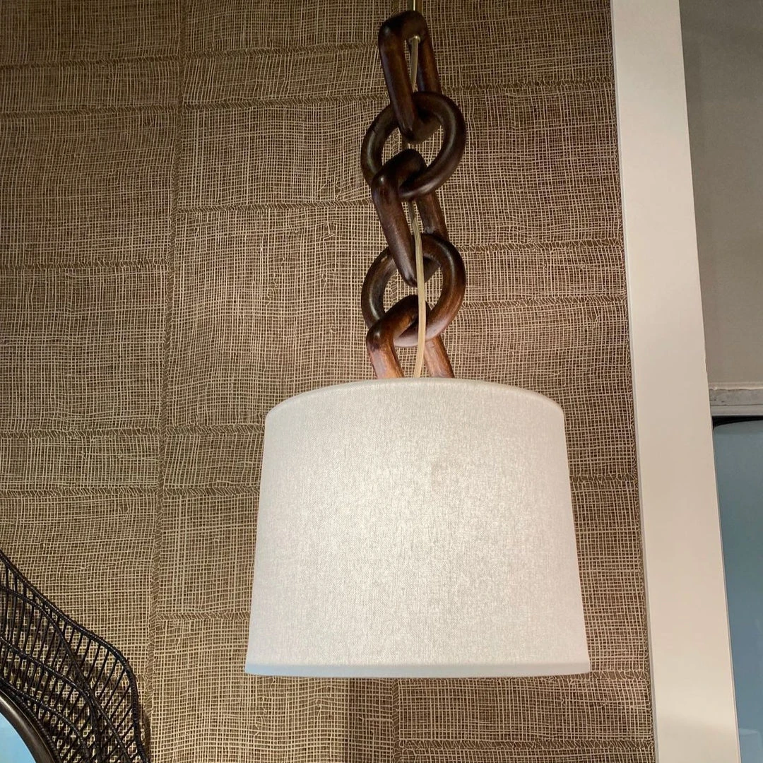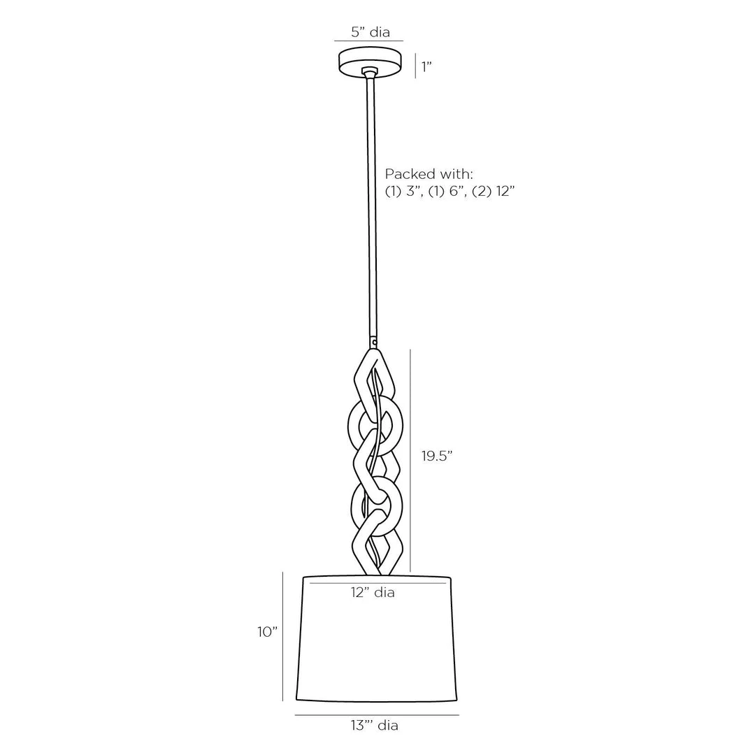 The Lindwood Pendant from Arteriors Home boldly expresses rustic refinement through a mixture of tones and textures. The focal point of the pendant is the oversized, interlocking wooden chain sculpture finished in warm ebony, suspended by an antique brass iron pipe. The carved chain is complemented by an off-white linen shade that lends a traditional element to its contemporary construction.
