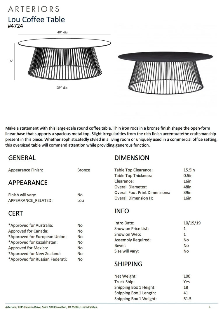 SKU: arteriors-home-4384380321840 Categories: Arteriors, Arteriors Home, Brands, Coffee Table, Furniture, New, New Arrivals, Tables Tags: Bronze, Bronze finish, Dec2019, Living room, Lou, Metal top, Oversized table, Round coffee table