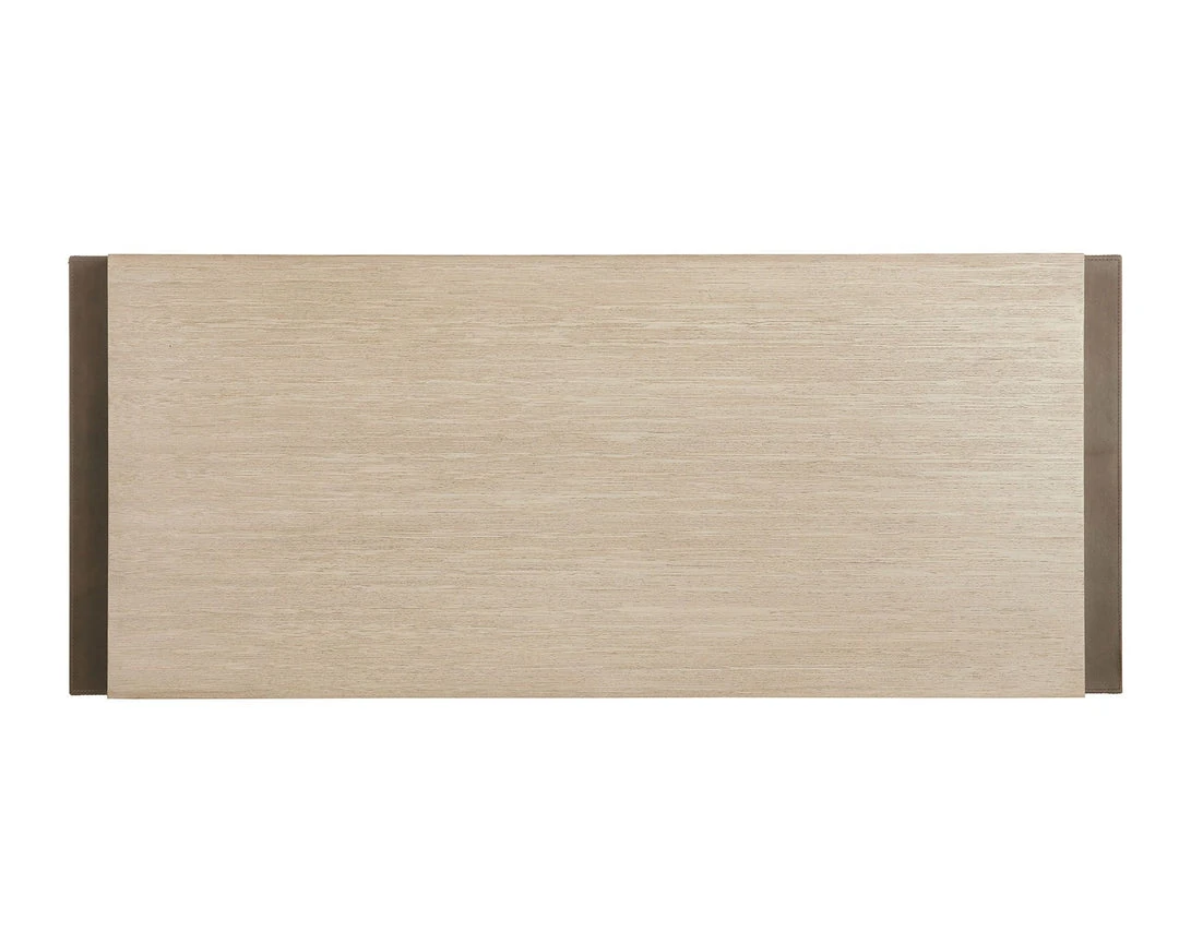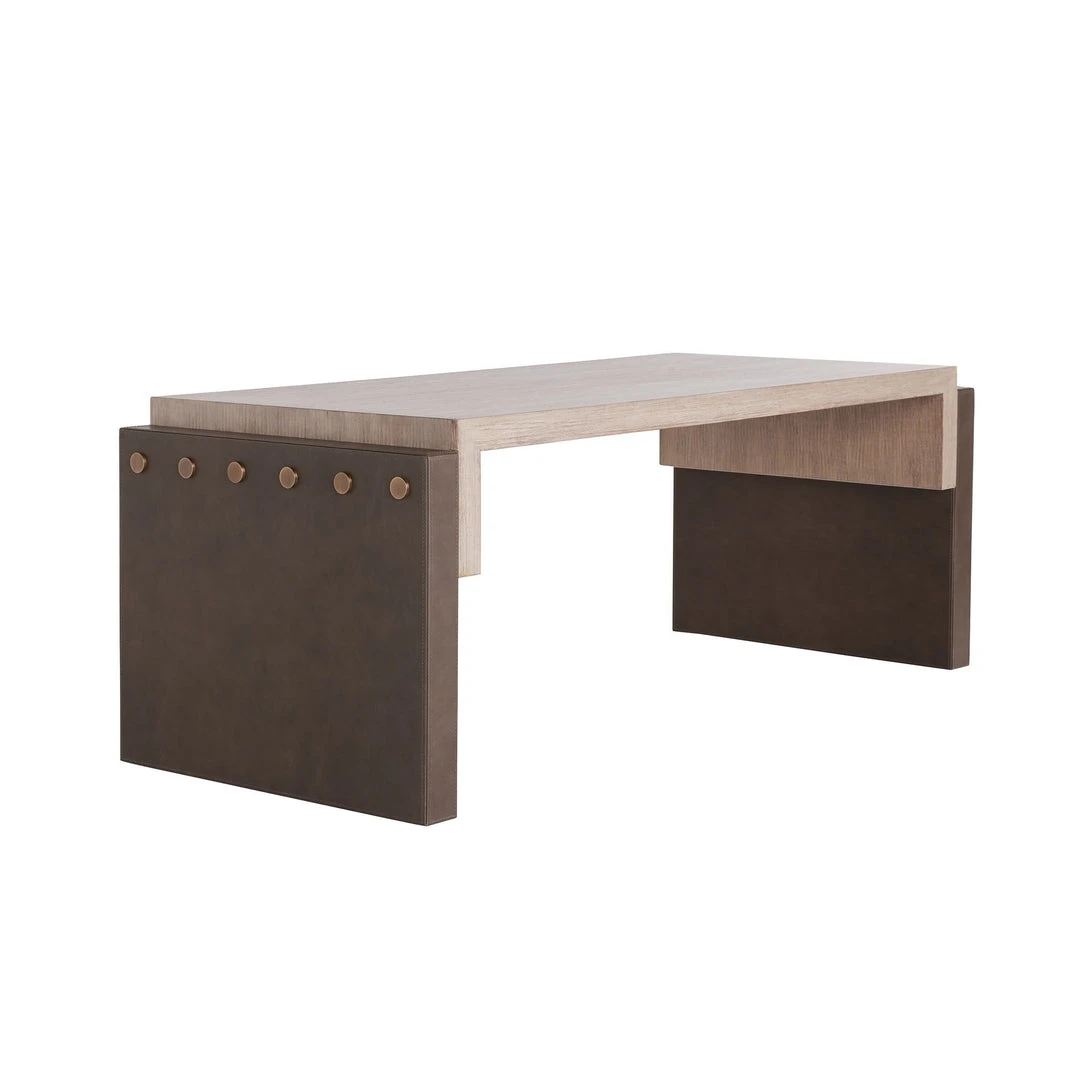 With its perfectly constructed form, the Luke Cocktail Table from Arteriors Home reveals exceptional details. The oak wood top in a smoke finish echos a classic waterfall edge before transitioning to charcoal leather sides. Exposed antique brass hardware fastens the mix of materials together. *Wood will vary.