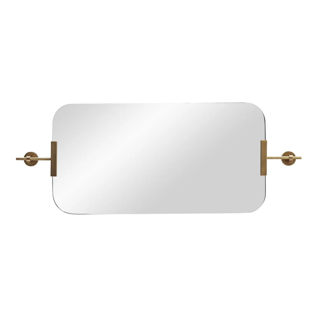 The Madden Mirror in Antique Brass from Arteriors Home hovers slightly against the wall, captivating with brilliant reflection. Two antique brass brackets hold a plain glass mirror with round, soft edges. The Madden can be hung vertically or horizontally on two security cleat attachments for ultimate versatility. Place the madden in your entryway, powder room or in pairs in the master bath.