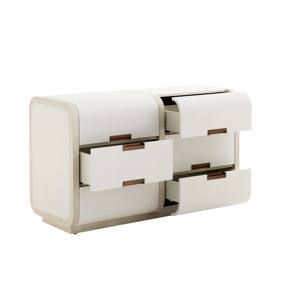 The Madison Chest from Arteiors Home brings a contemporary twist to a classic modern design The beige seagrass cloth construction is met with a matching beige oak veneer and large bronze-finished brass hardware – a beautiful blend of tones and textures. The top of the chest is curved to follow the arched silhouette down to the drawers and further enhances its modern aesthetic. *Wood and finish will vary.