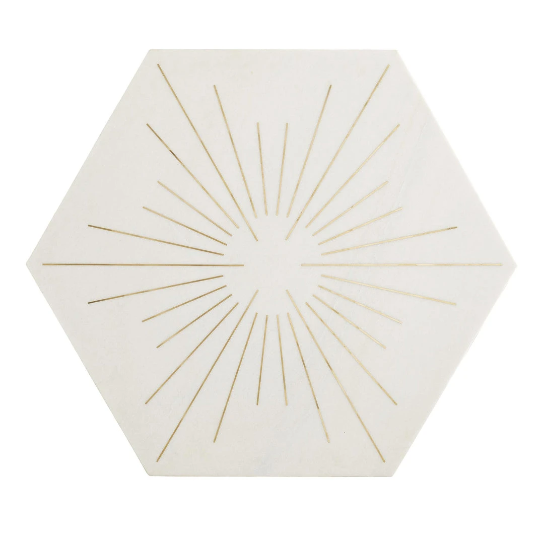 Arteriors Home presents the Mae Cocktail Table, bringing the brilliance of the sun to your space. Â Honed hexagonal white marble is inlaid with 30 pieces of polished brass, creating a brilliant sunburst design that is elegant and sophisticated. The six leg base is crafted from iron and detailed in an antique brass finish, with a silhouette that has a slightly Moroccan feel. *Marble tones may vary.