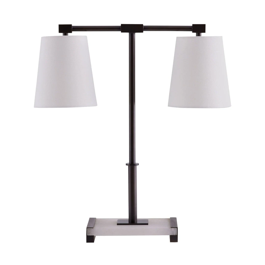 The classic library silhouette of the Messina Lamp in Bronze from Arteriors Home provides a beautiful balance to any tabletop. A slender, double-arm frame of bronze steel presents two tapered, off-white linen shades with an off-white cotton lining. The white alabaster base inset in a matching bronze steel frame for a more cohesive look. Finish will vary.