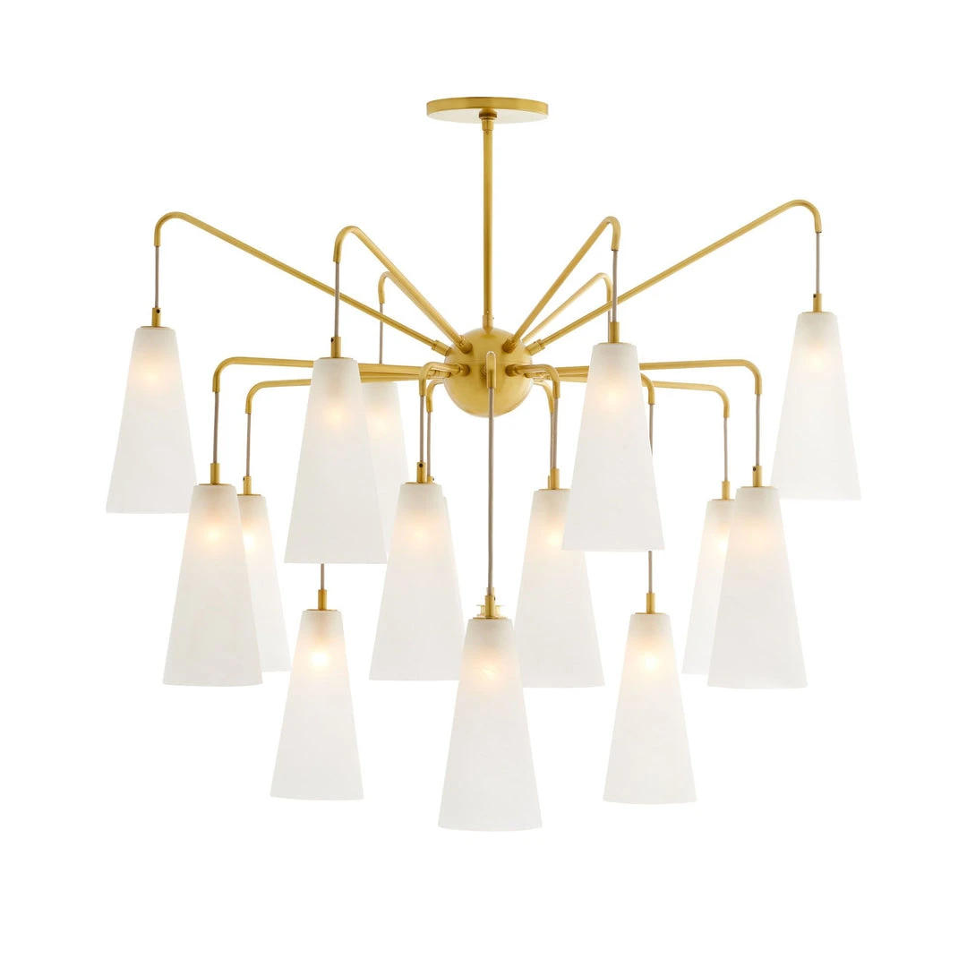 The Mika Chandelier from Arteriors Home reveals a bold design of modern lines and sophisticated materials. A staggered silhouette of antique brass steel arms spiders out to showcase 18 opal swirl glass shades in a matte finish. The stepped frame is dramatic in scale and features shades at various height drops for an impressive lightscape. Complete with a taupe cloth cord. *Additional pipe available (PIPE-422). Damp-rated, although limited covered outdoor areas may affect the finish.