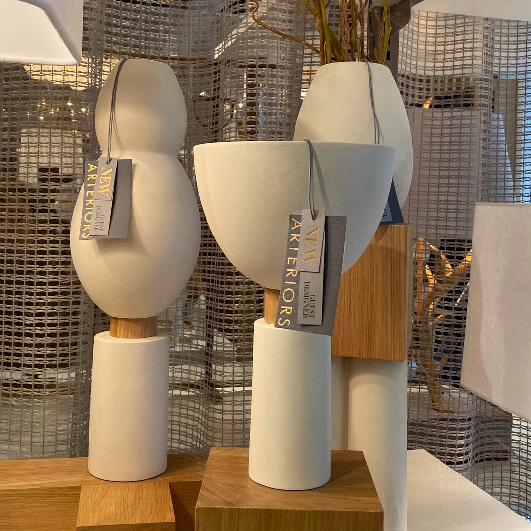 Designed by Ray Booth for Arteriors Home, the Mod Large Vase is inspired by the French sculptor Brancusi. The three ceramic forms play with mixed materials, juxtaposing matte ceramic against oak plinths. Each piece in the collection is sold separately so that you can use one as an accent or style all three together on dining or center tables. The best part? Each piece is interesting enough with or without flowers. *Mod short and tall vases also available in this collection