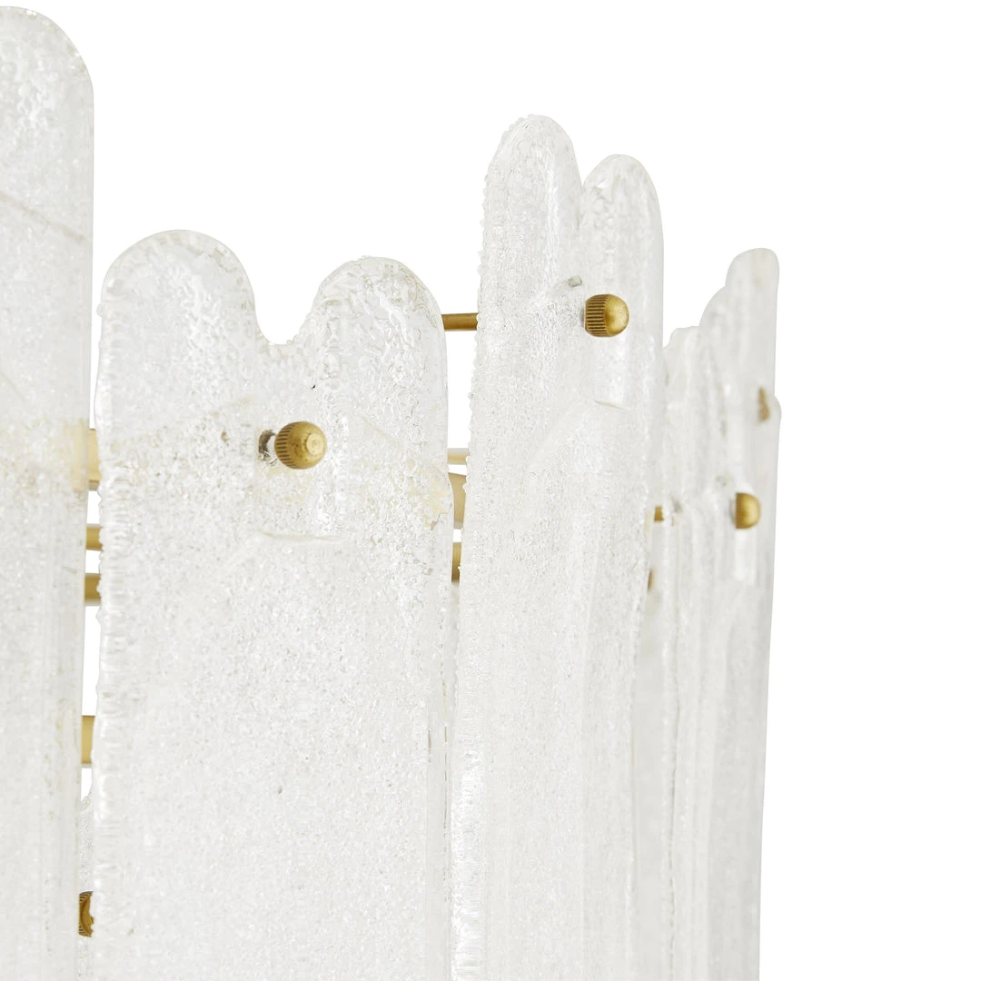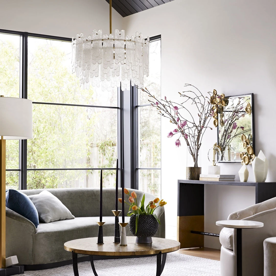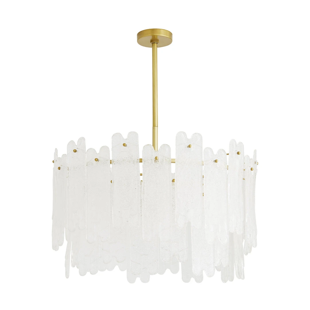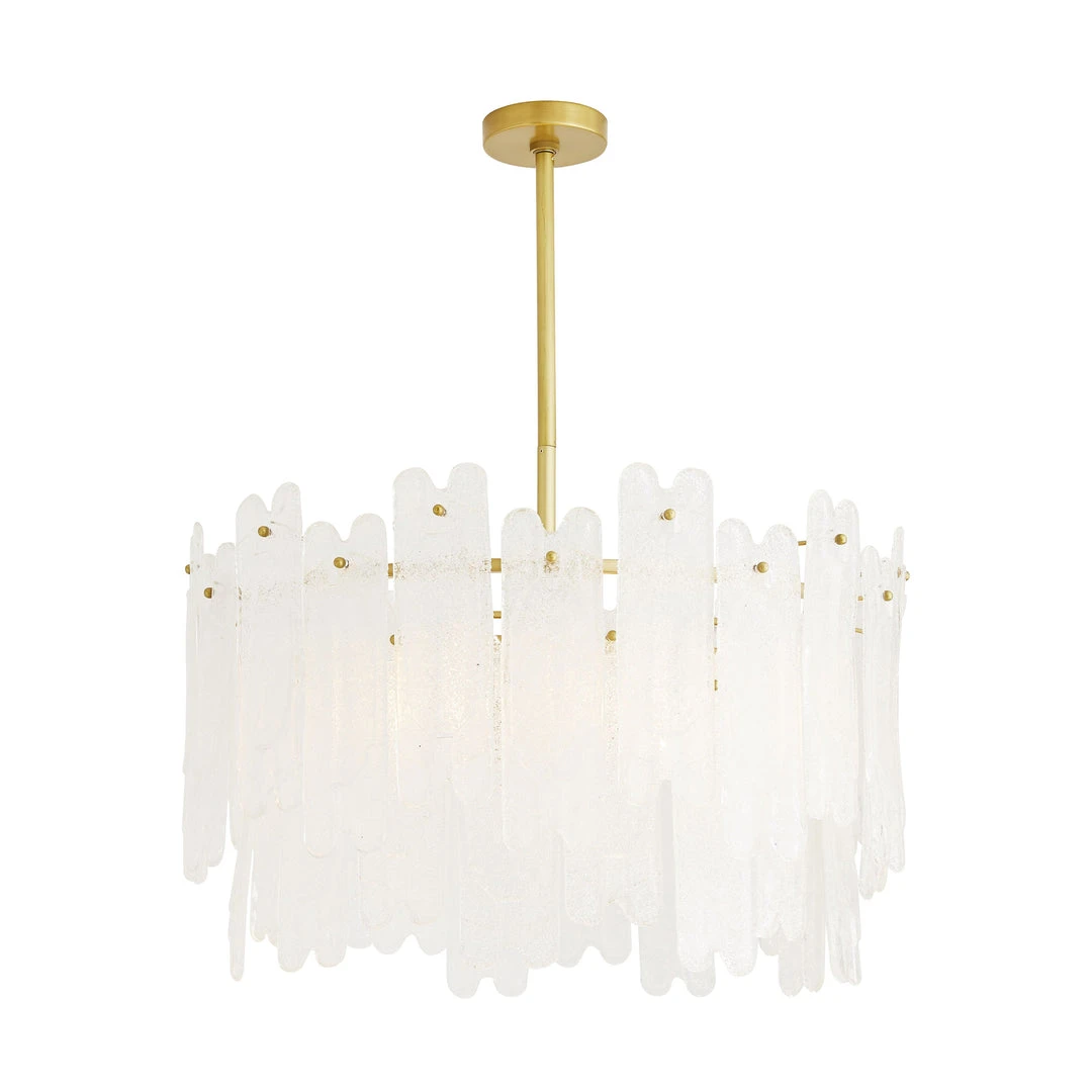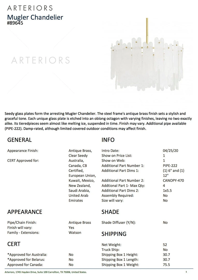 Seedy glass plates form the arresting Mugler Chandelier from Arteriors Home. The steel frame’s antique brass finish sets a stylish and graceful tone. Each unique glass plate is etched into an oblong octagon with varying finishes, leaving no two exactly alike. Its tiered pieces seem almost like melting ice, suspended in time. *Damp-rated, although limited covered outdoor conditions may affect the finish.