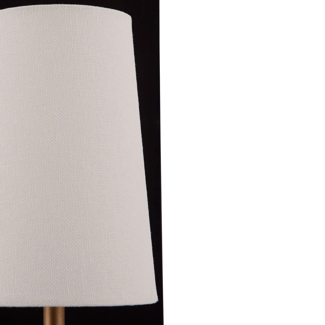 Modernism is established in the elegant and architecturally-inspired design of the Neo Sconce from Arteriors Home. A constructivist L-shape of blackened iron presents an antique brass iron collar topped with an off-white linen shade for a stark but striking contrast. Damp-rated, although limited covered outdoor areas may affect finish.