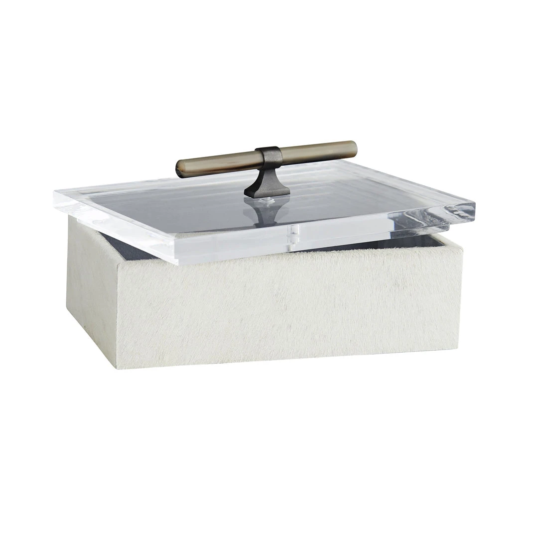 The Aliyah Box showcased by Arteriors Home is the ideal finishing touch accessory for your home. This natural white hide box makes for an exceptionally stylish way to store jewelry or treasured keepsakes. A clear acrylic top fashioned with a natural found-horn handle allows for a visually pleasing way to store your prized pieces while keeping them secure. The slate-colored micro-suede lining provides an extra element of elegance and protection. *Finish may vary.