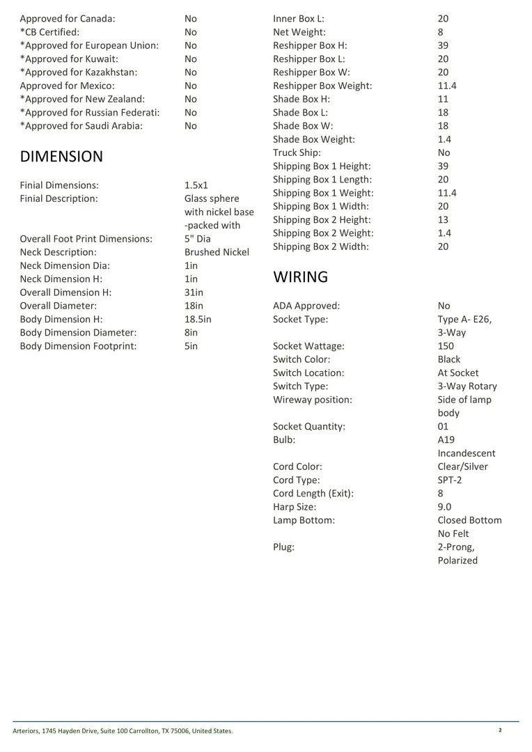 | Materials | Mercury Glass; Nickel Plated Hardware; Requires One 120 Volt A19 Medium Base Incandescent Bulb; White Shade |