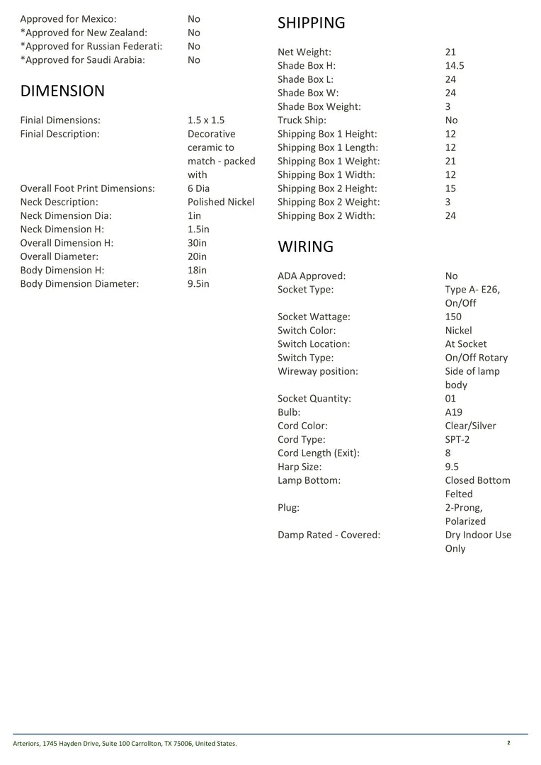 | Materials | Ceramic; Socket Wattage:150; Switch Type: On/Off Rotary; Socket Quantity:01; Bulb: A19; Cord Color:Clear/Silver; Cord Type: SPT-2; Cord Length (Exit):8; Harp Size:9.5 |