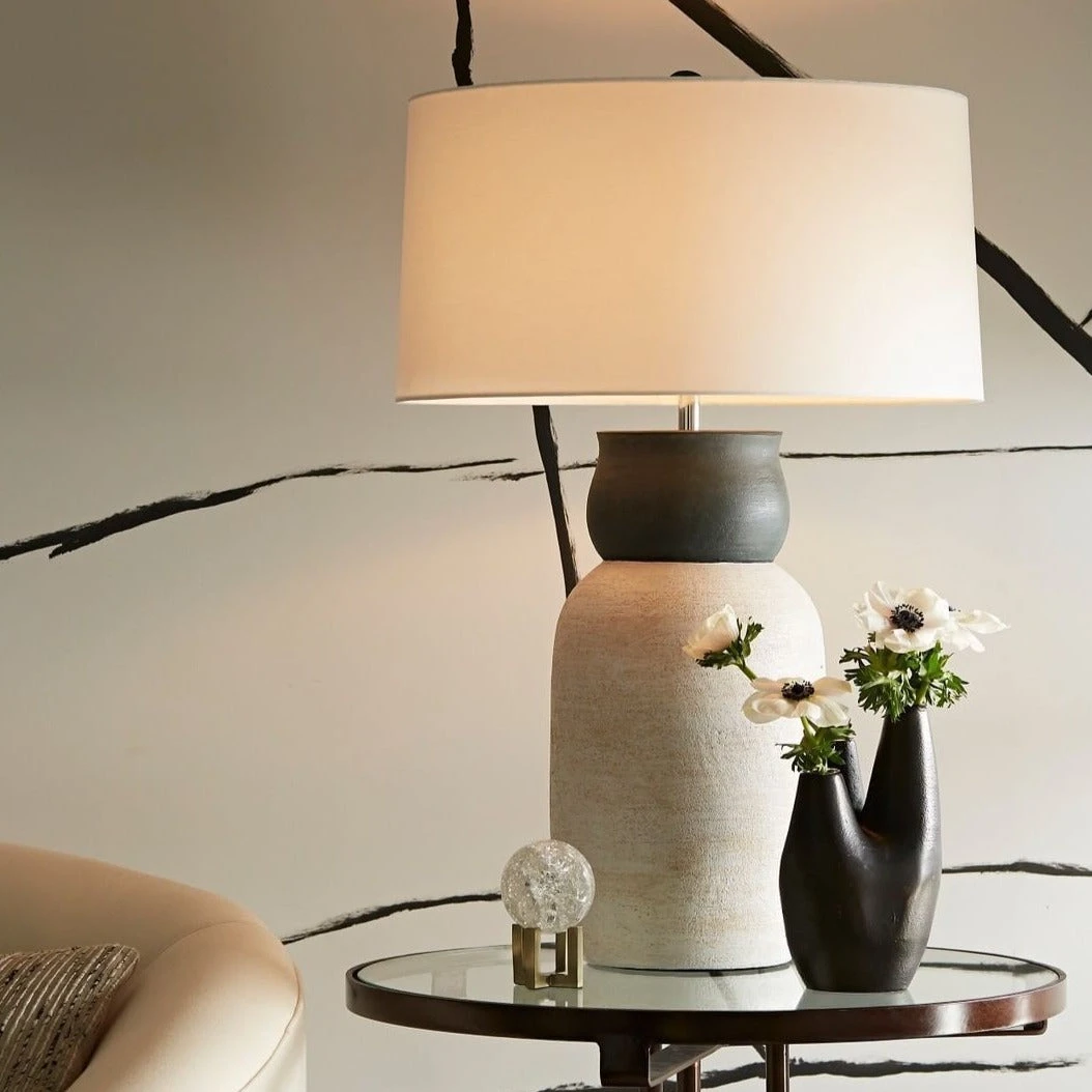 An organic take on color-blocking, the Ansley Lamp presented by Arteriors Home boasts a sculptural base in a two-tone finish that captures style and sophistication. The lamp’s base features a smooth neck in a midnight terracotta finish that blends seamlessly into the textured base in a whitewash finish. This contrast of tones and texture creates a unique look. Topped with an off-white cotton drum shade with off-white cotton lining and a matching finial, place the Ansley in pairs on either side of the bed or sofa. *Finish may vary.