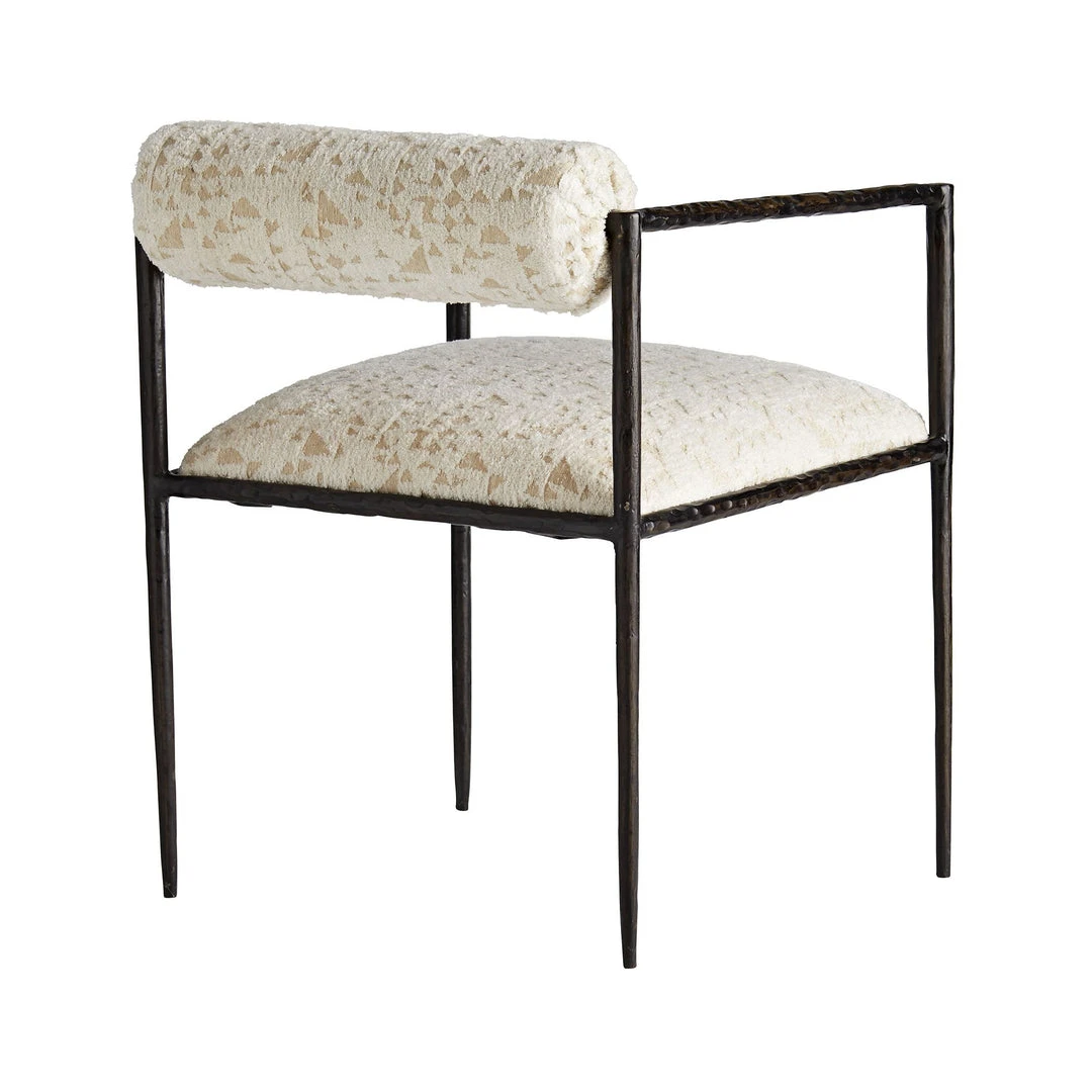 The exquisite Barbana Chair on Facet Cream Chenille from Arteriors Home is perfectly poised, perched on delicate legs that are as faint as an insect’s. The natural iron body has been hand forged, yielding soft impressions along with the sharp-angled frame. The tight seat and bolster back cushion are covered in a luxurious facet cream chenille upholstery, with thread detailing for a modern edge. *Finish may vary.