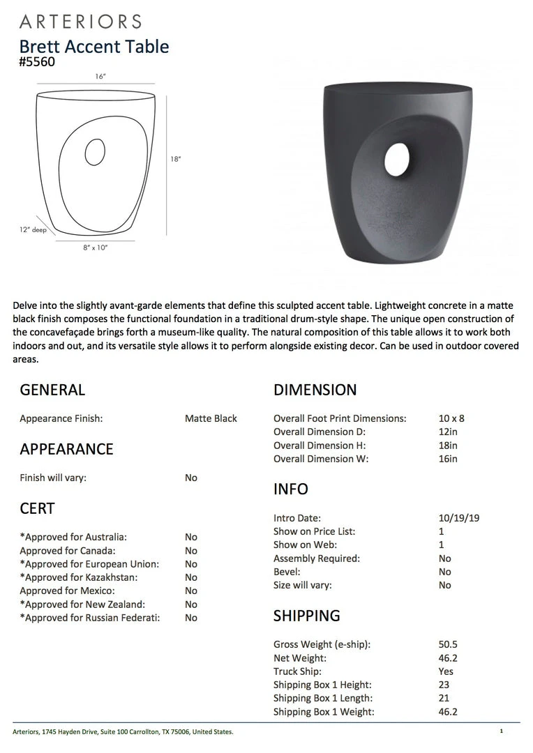 Delve into the slightly avant-garde elements that define the Brett Accent Table from Arteriors Home. Lightweight concrete in a matte black finish composes the functional foundation in a traditional drum-style shape. The unique open construction of the concave façade brings forth a museum-like quality. The natural composition of this table allows it to work both indoors and out, and its versatile style allows it to perform alongside existing decor.