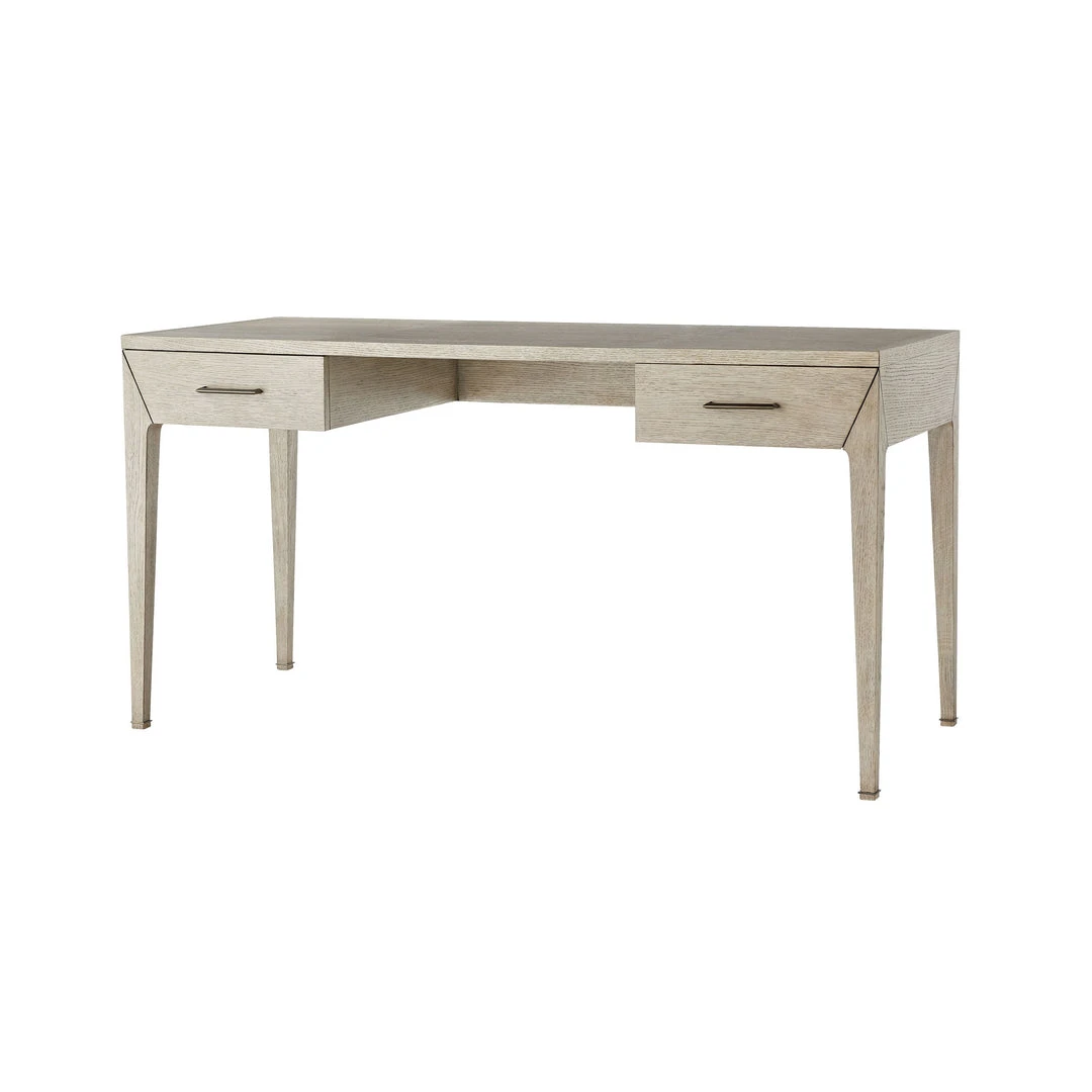 The petite Dublin Desk from Arteriors Home puts forth a simple and straightforward style. Its functional design favors clean lines and absolute angles that define the space it occupies. A smoke finish enhances the natural grains of its solid oak construction, and faceted vintage brass pulls effortlessly elevate its modest aesthetic. Smaller in scale, we see this piece best utilized as a compact desk or a vanity table.
