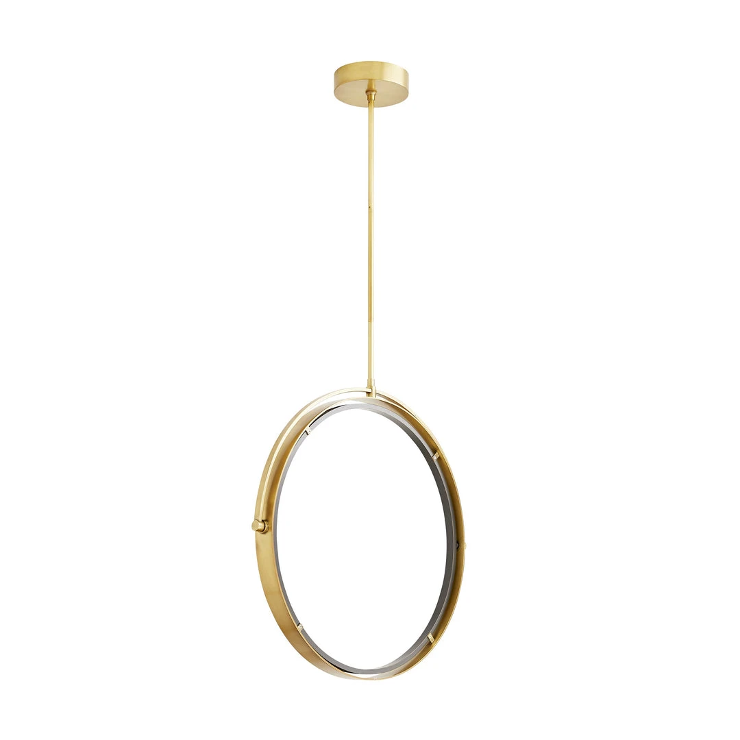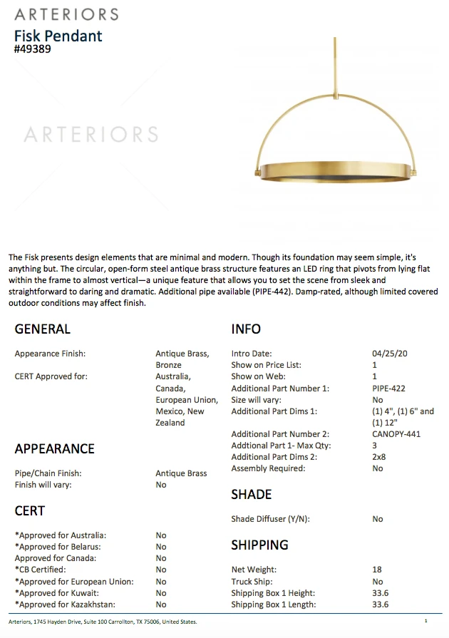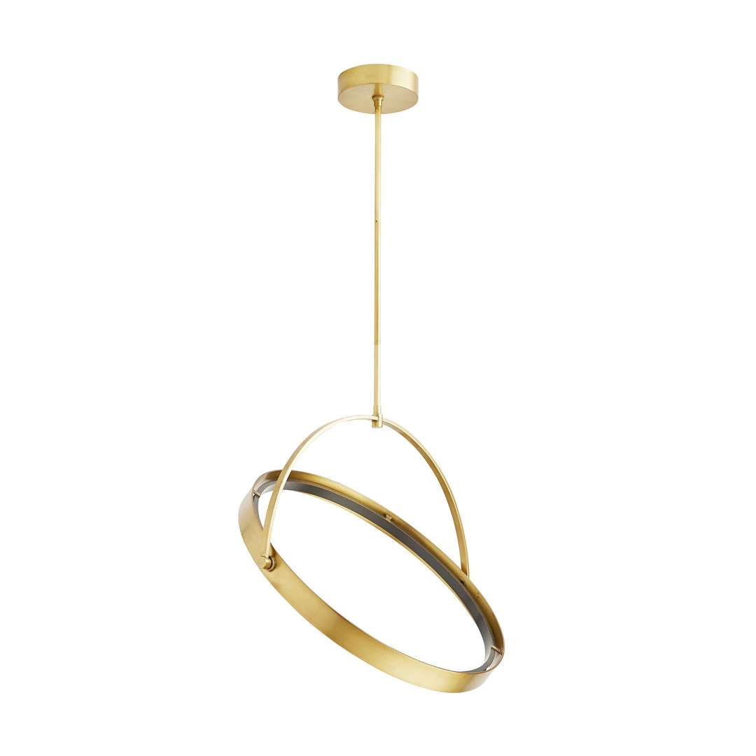 The Fisk Pendant in Antique Brass from Arteriors Home presents design elements that are minimal and modern. Though its foundation may seem simple, it’s anything but. The circular, open-form steel antique brass structure features an LED ring that pivots from lying flat within the frame to almost vertical—a unique feature that allows you to set the scene from sleek and straightforward to daring and dramatic. *Additional pipe available (PIPE-442). **Damp-rated, although limited covered outdoor conditions may affect the finish.