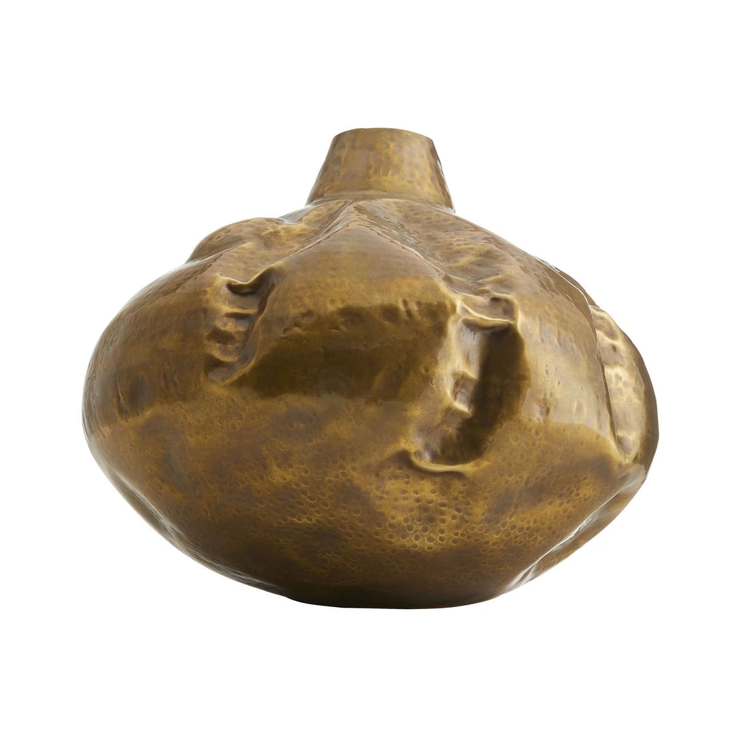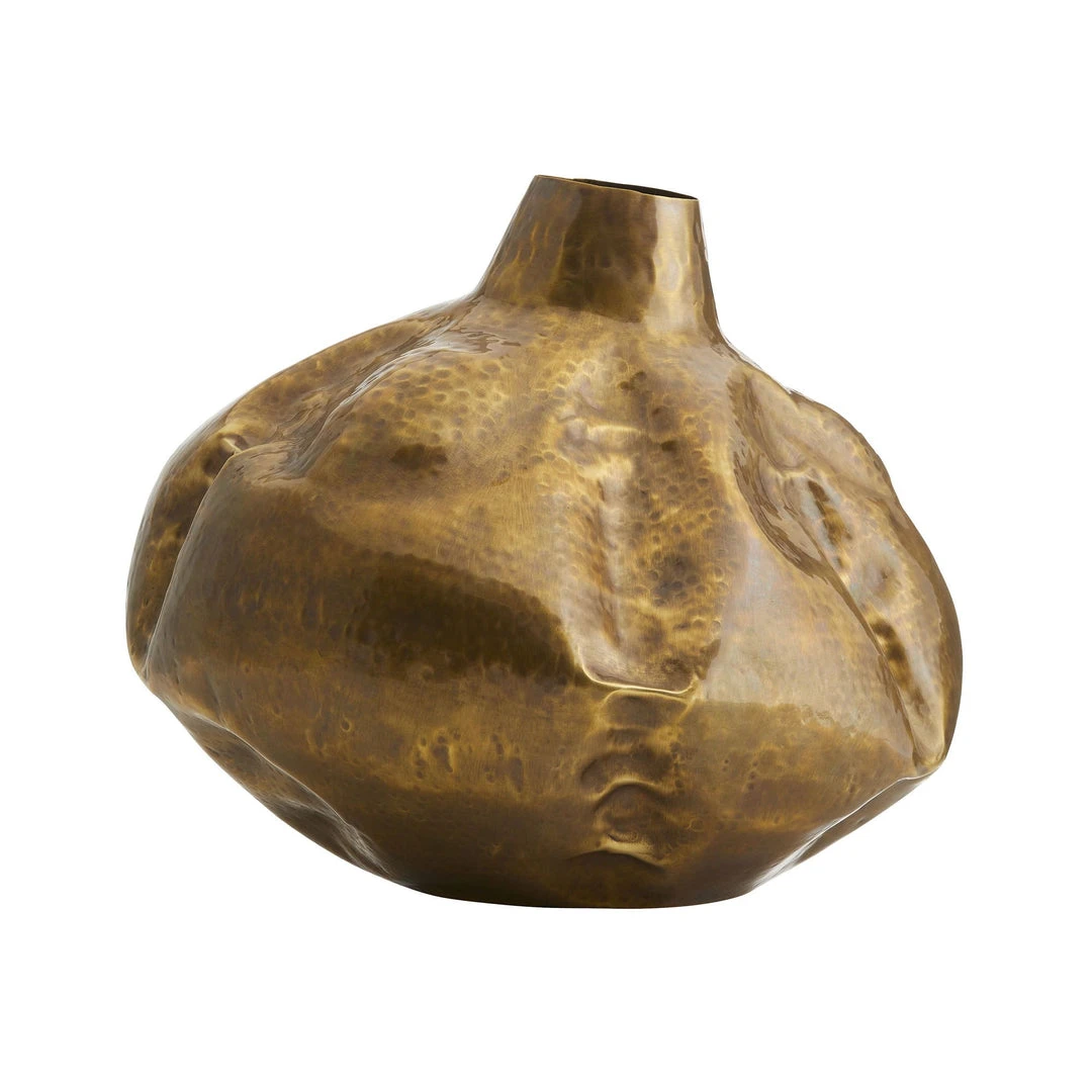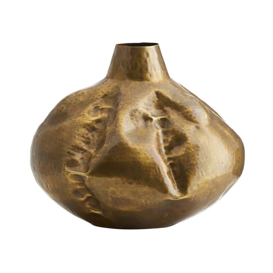 The Jasper Large Vase from Arteriors Home features a shape and design that are inspired by large woven baskets used as water jugs, The Jasper is crafted from stately vintage brass with a finish that gives it an aged appearance. Display it as a sculptural piece, double it as a vase, or showcase it with a smaller-scale version. *Hammered pattern will vary.